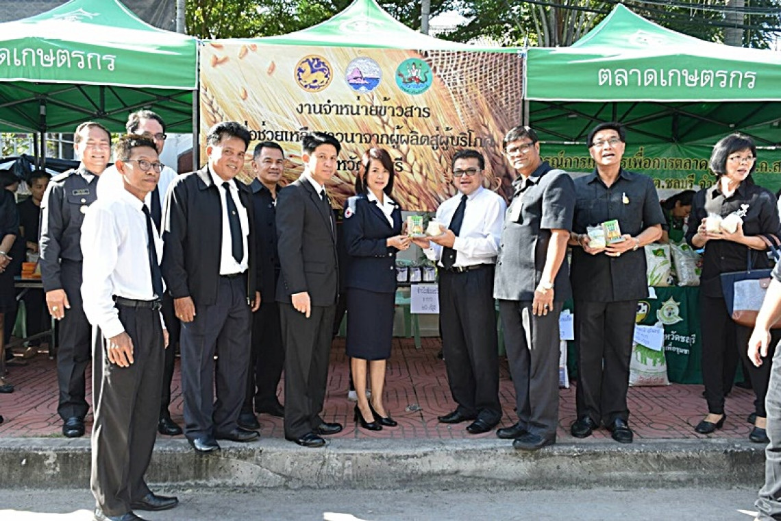 นายภัครธรณ์ เทียนไชย ผู้ว่าราชการจังหวัดชลบุรี กล่าวว่า สืบเนื่องจากปัจจุบันราคาข้าวเปลือกกำลังประสบปัญหาราคาตกต่ำ รัฐบาลมีนโยบายที่จะช่วยเหลือเกษตรกรชาวนาให้จำหน่ายข้าวเปลือกในราคาสูงขึ้น จึงได้มอบหมายให้ สำนักงานสหกรณ์จังหวัดชลบุรี จัดงานจำหน่ายข้าวสารในราคายุติธรรม จากผู้ผลิตสู่ผู้บริโภคโดยตรง เพื่อเป็นการลดต้นทุนการจัดการด้านการตลาด ทั้งนี้ภายในงานจะมีข้าวสารหอมมะลิ ตรา “เอไลท์” ของจังหวัดสุรินทร์ ราคาถุงละ 160 บาท ข้าวหอมมะลิ ตรา “ทุ่งกุลาร้องไห้” จังหวัดร้อยเอ็ด ราคาถุงละ 160 บาท ข้าวหอมมะลิ ตรา “ตักศิลา” จังหวัดมหาสารคาม ราคาถุงละ 185 บาท และข้าวไรซ์เบอรี่ ราคาถุงละ 100 บาท มาจำหน่ายในราคายุติธรรม เป็นการช่วยเหลือชาวนาโดยตรง จากสหกรณ์การเกษตรสามตำบลร่วมใจพัฒนา จำกัด กลุ่มวิสาหกิจชุมชนชาวนาตำบลหนองปรือ ศูนย์กระจายสินค้าจังหวัดชลบุรี โดยสหกรณ์การเกษตรเพื่อการตลาดลูกค้า ธ.ก.ส. จำกัด และกลุ่มสมาชิกสหกรณ์การเกษตร ล้วนแต่เป็นข้าวที่เปี่ยมไปด้วยคุณภาพ มุ่งเน้นให้เกษตรกรนำสินค้าเกษตร มาจำหน่ายจากเกษตรกรสู่ผู้บริโภคโดยตรง โดยไม่ผ่านพ่อค้าคนกลาง อันเป็นการเพิ่มช่องทางการตลาด และเสริมสร้างรายได้ให้แก่เกษตรกรผู้ปลูกข้าวด้วย