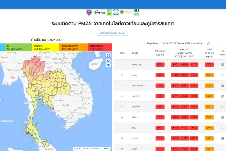 กระทรวงการอุดมศึกษา วิทยาศาสตร์ วิจัยและนวัตกรรม (อว.) โดยสำนักงานพัฒนาเทคโนโลยีอวกาศและภูมิสารสนเทศ (องค์การมหาชน) หรือ GISTDA ร่วมกับสำนักงานการวิจัยแห่งชาติ, กรมควบคุมมลพิษ, มหาวิทยาลัยเกษตรศาสตร์ และมหาวิทยาลัยเชียงใหม่ เกาะติดสถานการณ์ฝุ่น PM 2.5 แบบรายชั่วโมง ด้วยข้อมูลจากดาวเทียมผ่านแอปพลิเคชั่น “เช็คฝุ่น” เมื่อเวลา 09.00 น. ของวันที่ 25 มีนาคม 2567 พบ 14 จังหวัดของประเทศ มีค่าฝุ่นเกินเกณฑ์มาตรฐานในระดับสีแดง ที่มีผลกระทบต่อสุขภาพและระบบทางเดินหายใจ ได้แก่ #แม่ฮ่องสอน 129.1 ไมโครกรัม #ลำพูน 108.5 ไมโครกรัม #อำนาจเจริญ 104.8 ไมโครกรัม #มุกดาหาร 103.4 ไมโครกรัม #เชียงใหม่ 96.1 ไมโครกรัม #ยโสธร 91.8 ไมโครกรัม #ตาก 86.7 ไมโครกรัม #ลำปาง 85.2 ไมโครกรัม #พะเยา 84.7 ไมโครกรัม #อุบลราชธานี 82.3 ไมโครกรัม #กาฬสินธุ์ 79.3 ไมโครกรัม #ร้อยเอ็ด 78.8 ไมโครกรัม #น่าน 76.3 ไมโครกรัม และ #เชียงราย 75.1 ไมโครกรัม ในขณะที่อีก 23 จังหวัดมีค่าเกินมาตรฐานในระดับสีส้มที่เริ่มมีผลต่อสุขภาพและระบบทางเดินหายใจ