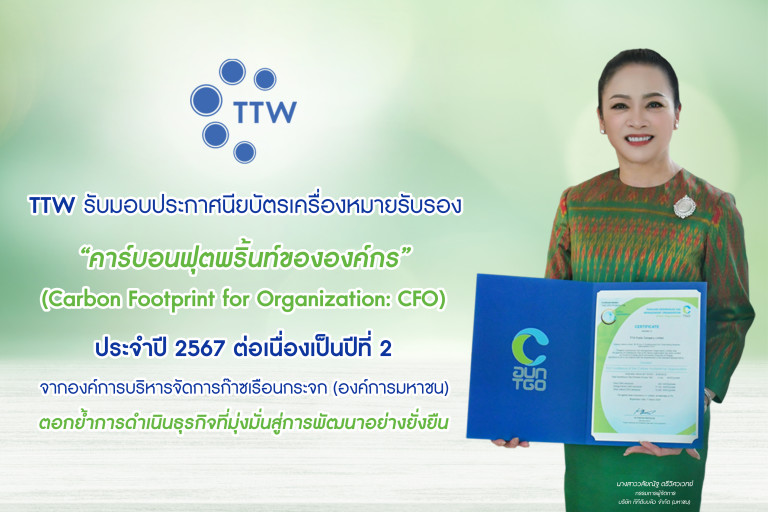 บริษัท ทีทีดับบลิว จำกัด (มหาชน) หรือ TTW ได้รับประกาศนียบัตรการรับรองคาร์บอนฟุตพริ้นท์ขององค์กร (Carbon Footprint for Organization: CFO) โดยองค์การบริหารจัดการก๊าซเรือนกระจก (องค์การมหาชน) ประจำปี 2567 ต่อเนื่องเป็นปีที่ 2 ณ องค์การบริหารจัดการก๊าซเรือนกระจก (องค์การมหาชน) ศูนย์ราชการเฉลิมพระเกียรติฯ