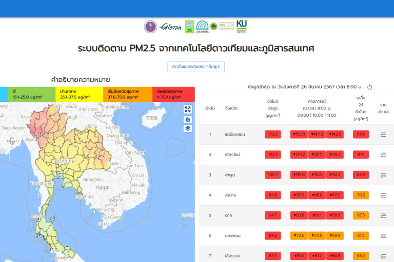 กระทรวงการอุดมศึกษา วิทยาศาสตร์ วิจัยและนวัตกรรม (อว.) โดยสำนักงานพัฒนาเทคโนโลยีอวกาศและภูมิสารสนเทศ (องค์การมหาชน) หรือ GISTDA ร่วมกับสำนักงานการวิจัยแห่งชาติ, กรมควบคุมมลพิษ, มหาวิทยาลัยเกษตรศาสตร์ และมหาวิทยาลัยเชียงใหม่ เกาะติดสถานการณ์ฝุ่น PM 2.5 แบบรายชั่วโมง ด้วยข้อมูลจากดาวเทียมผ่านแอปพลิเคชั่น “เช็คฝุ่น” เมื่อเวลา 08.00 น. ของวันที่ 26 มีนาคม 2567 พบ 12 จังหวัดของประเทศ มีค่าฝุ่นเกินเกณฑ์มาตรฐานในระดับสีแดง ที่มีผลกระทบต่อสุขภาพและระบบทางเดินหายใจ ได้แก่ #แม่ฮ่องสอน 172.2 ไมโครกรัม #เชียงใหม่ 132.3 ไมโครกรัม #ลำพูน 130.7 ไมโครกรัม #ลำปาง 94.8 ไมโครกรัม #ตาก 94.7 ไมโครกรัม #นครพนม 84.2 ไมโครกรัม #เชียงราย 83.3 ไมโครกรัม #แพร่ 83 ไมโครกรัม #น่าน 82.4 ไมโครกรัม #พะเยา 78.4 ไมโครกรัม #สุโขทัย 77.8 ไมโครกรัม #มุกดาหาร 75.6 ไมโครกรัม ในขณะที่อีก 27 จังหวัดมีค่าเกินมาตรฐานในระดับสีส้ม ที่เริ่มมีผลต่อสุขภาพและระบบทางเดินหายใจ