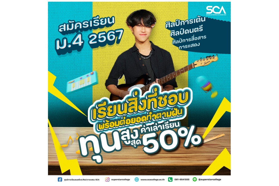 ศูนย์การเรียนดนตรีและศิลปะการแสดง SCA (Superstar College of Arts) เปิดสอบชิงทุนการศึกษา ปี 2567ระดับมัธยมปลาย ด้านดนตรี, การแสดง, การเต้น สำหรับผู้ที่สนใจศึกษาต่อคณะศิลปกรรมศาสตร์ นิเทศศาสตร์ ดุริยางคศิลป์ หรือสายด้านดนตรีและศิลปะการแสดงมาสมารถยื่น Portfolio และความสามารถพิเศษ โดยมีแผนการเรียน ศิลป์ดนตรี (ขับร้อง, กีต้าร์ไฟฟ้า, กลองชุด, เบส, เปียโน, เครื่องดีเจ, ไวโอลิน) , ศิลป์การสื่อสารการแสดง และ ศิลป์การเต้น โครงสร้างหลักสูตรเรียนจบได้รับรองจากกระทรวงศึกษาธิการใช้ยื่นสอบเข้ามหาวิทยาลัยได้ ผู้ที่สนใจและมีความสามารถพิเศษสมัครเข้าร่วมออดิชั่นเพื่อชิงทุนการศึกษาและรับสมัครตรง ได้แล้วตั้งแต่วันนี้จนถึง