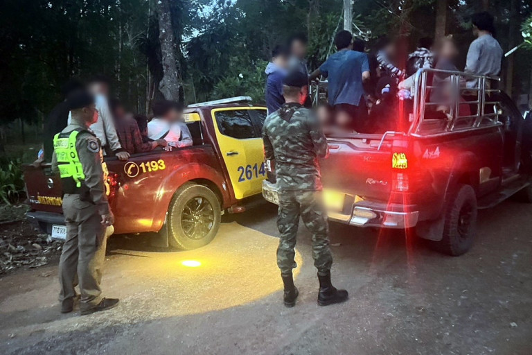 4.บนถนนหน้าโรงเรียนจันทเดย์ หมู่ที่ 3 ตำบลท่าขนุน อำเภอทองผาภูมิ รถกระบะจำนวน 2 คัน ยี่ห้อโตโยต้ารุ่นวีโก้ ทะเบียนกรุงเทพฯ และรถกระบะโตโยต้า รุ่น รีโว้ สีเทา ทะเบียนราชบุรี ได้ผู้ต้องหารวม 35 คน และผู้ติดตาม 7 คน