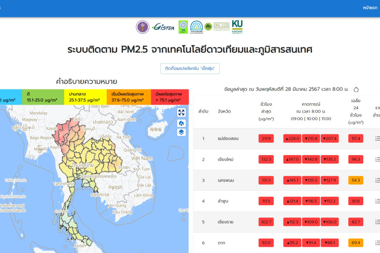 กระทรวงการอุดมศึกษา วิทยาศาสตร์ วิจัยและนวัตกรรม (อว.) โดยสำนักงานพัฒนาเทคโนโลยีอวกาศและภูมิสารสนเทศ (องค์การมหาชน) หรือ GISTDA ร่วมกับสำนักงานการวิจัยแห่งชาติ, กรมควบคุมมลพิษ, มหาวิทยาลัยเกษตรศาสตร์ และมหาวิทยาลัยเชียงใหม่ เกาะติดสถานการณ์ฝุ่น PM 2.5 แบบรายชั่วโมง ด้วยข้อมูลจากดาวเทียมผ่านแอปพลิเคชั่น “เช็คฝุ่น” เมื่อเวลา 08.00 น. ของวันที่ 28 มีนาคม 2567 พบ 9 จังหวัดทางภาคเหนือ มีค่าฝุ่นเกินเกณฑ์มาตรฐานในระดับสีแดง ที่มีผลกระทบต่อสุขภาพและระบบทางเดินหายใจ ได้แก่ #แม่ฮ่องสอน 211.9 ไมโครกรัม #เชียงใหม่ 132.3 ไมโครกรัม #นครพนม 131.3 ไมโครกรัม #ลำพูน 111.5 ไมโครกรัม #เชียงราย 102.7 ไมโครกรัม #ตาก 92 ไมโครกรัม #พะเยา 84.5 ไมโครกรัม #ลำปาง 83.2 ไมโครกรัม และ#น่าน 77.3 ไมโครกรัม ในขณะที่อีก 25 จังหวัดมีค่าเกินมาตรฐานในระดับสีส้ม ที่เริ่มมีผลต่อสุขภาพและระบบทางเดินหายใจ