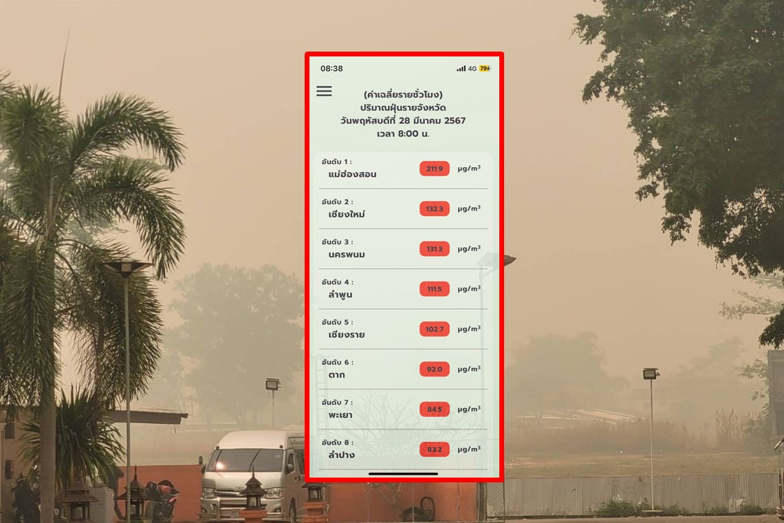 กระทรวงการอุดมศึกษา วิทยาศาสตร์ วิจัยและนวัตกรรม (อว.) โดยสำนักงานพัฒนาเทคโนโลยีอวกาศและภูมิสารสนเทศ (องค์การมหาชน) หรือ GISTDA ร่วมกับสำนักงานการวิจัยแห่งชาติ, กรมควบคุมมลพิษ, มหาวิทยาลัยเกษตรศาสตร์ และมหาวิทยาลัยเชียงใหม่ เกาะติดสถานการณ์ฝุ่น PM 2.5 แบบรายชั่วโมง ด้วยข้อมูลจากดาวเทียมผ่านแอปพลิเคชั่น “เช็คฝุ่น” เมื่อเวลา 08.00 น. ของวันที่ 28 มีนาคม 2567 พบ 9 จังหวัดทางภาคเหนือ มีค่าฝุ่นเกินเกณฑ์มาตรฐานในระดับสีแดง ที่มีผลกระทบต่อสุขภาพและระบบทางเดินหายใจ ได้แก่ #แม่ฮ่องสอน 211.9 ไมโครกรัม #เชียงใหม่ 132.3 ไมโครกรัม #นครพนม 131.3 ไมโครกรัม #ลำพูน 111.5 ไมโครกรัม #เชียงราย 102.7 ไมโครกรัม #ตาก 92 ไมโครกรัม #พะเยา 84.5 ไมโครกรัม #ลำปาง 83.2 ไมโครกรัม และ#น่าน 77.3 ไมโครกรัม ในขณะที่อีก 25 จังหวัดมีค่าเกินมาตรฐานในระดับสีส้ม ที่เริ่มมีผลต่อสุขภาพและระบบทางเดินหายใจ