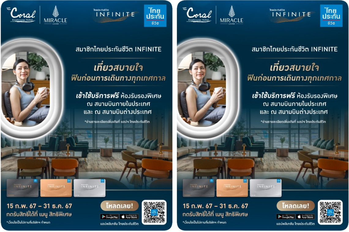 บริษัท ไทยประกันชีวิต จำกัด (มหาชน) ส่งมอบประสบการณ์สุดพิเศษสำหรับลูกค้าที่เป็นสมาชิกไทยประกันชีวิต Infinite ระดับ Platinum ระดับ Gold และ ระดับ Silver กับบริการ ห้องรับรองพิเศษ ณ สนามบินภายในประเทศและต่างประเทศ (Airport Lounge) สมาชิกไทยประกันชีวิต Infinite สามารถเลือกรับบริการห้องรับรองพิเศษ The Coral Lounge หรือ Miracle Lounge สำหรับสนามบินภายในประเทศ รวมถึงบริการห้องรับรองพิเศษในสนามบินต่างประเทศ โดยกดรับสิทธิ์ผ่านแอปพลิเคชัน ไทยประกันชีวิต ตั้งแต่วันนี้ถึง 31 ธันวาคม 2567