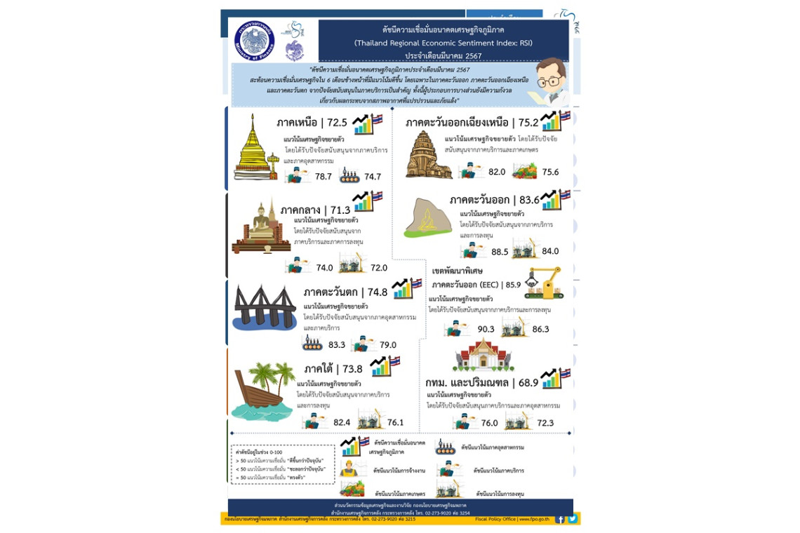 ดัชนีความเชื่อมั่นอนาคตเศรษฐกิจภูมิภาคประจำเดือนมี.ค.67 สะท้อนความเชื่อมั่นเศรษฐกิจใน 6 เดือนข้างหน้าที่มีแนวโน้มดีขึ้น โดยเฉพาะในภาคตะวันออก ภาคตะวันออกเฉียงเหนือ และภาคตะวันตก จากปัจจัยสนับสนุนในภาคบริการเป็นสำคัญ ทั้งนี้ ผู้ประกอบการบางส่วนยังมีความกังวลเกี่ยวกับผลกระทบจากสภาพอากาศที่แปรปรวนและภัยแล้ง”