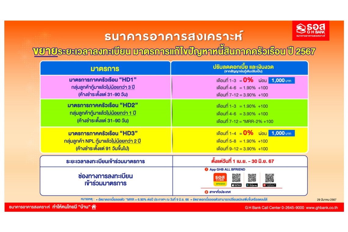 ธนาคารอาคารสงเคราะห์ (ธอส.) สานต่อนโยบายรัฐบาลและกระทรวงการคลังในการช่วยเหลือลูกค้ากลุ่มที่ต้องเฝ้าระวังเป็นพิเศษ (SM) และลูกค้าสถานะ NPL ที่ยังคงได้รับผลกระทบด้านรายได้ ให้ได้รับความช่วยเหลือนาน 1 ปี ผ่าน 3 มาตรการแก้ไขปัญหาหนี้สินภาคครัวเรือน ปี 2567 ด้วยการขยายเวลาลงทะเบียนให้กับลูกค้า ต่ออีก 3 เดือน (วันที่ 1 เมษายน - 30 มิถุนายน 2567) โดยลูกค้าที่สนใจสามารถลงทะเบียนแจ้งความประสงค์เข้าร่วมมาตรการผ่าน Application : GHB ALL BFRIEND และสาขาทั่วประเทศ
