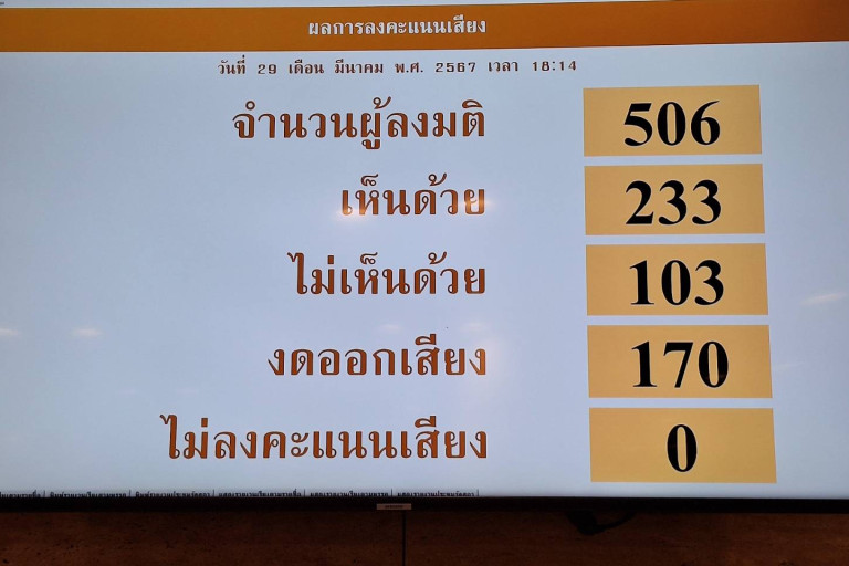 วันที่ 29 มี.ค.2567 ที่รัฐสภา ในการประชุมร่วมกันของรัฐสภา ที่มีนายพรเชร วิชิตชลชัย รองประธานรัฐสภา ทำหน้าที่ประธานการประชุม พิจารณาญัตติตามข้อบังคับการประชุมรัฐสภา พ.ศ.2563 ข้อ31 ให้รัฐสภามีมติส่งศาลรัฐธรรมนูญพิจารณาวินิจฉัยเกี่ยวกับหน้าที่และอำนาจของรัฐสภาตามรัฐธรรมนูญ มาตรา210 (2) ที่นายชูศักดิ์ ศิรินิล สส.บัญชีรายชื่อ พรรคเพื่อไทย และคณะ เป็นผู้เสนอ โดยภายหลังจากที่สมาชิกรัฐสภาอภิปรายกันอย่างกว้างขวาง รวมกว่า 6 ชั่วโมง