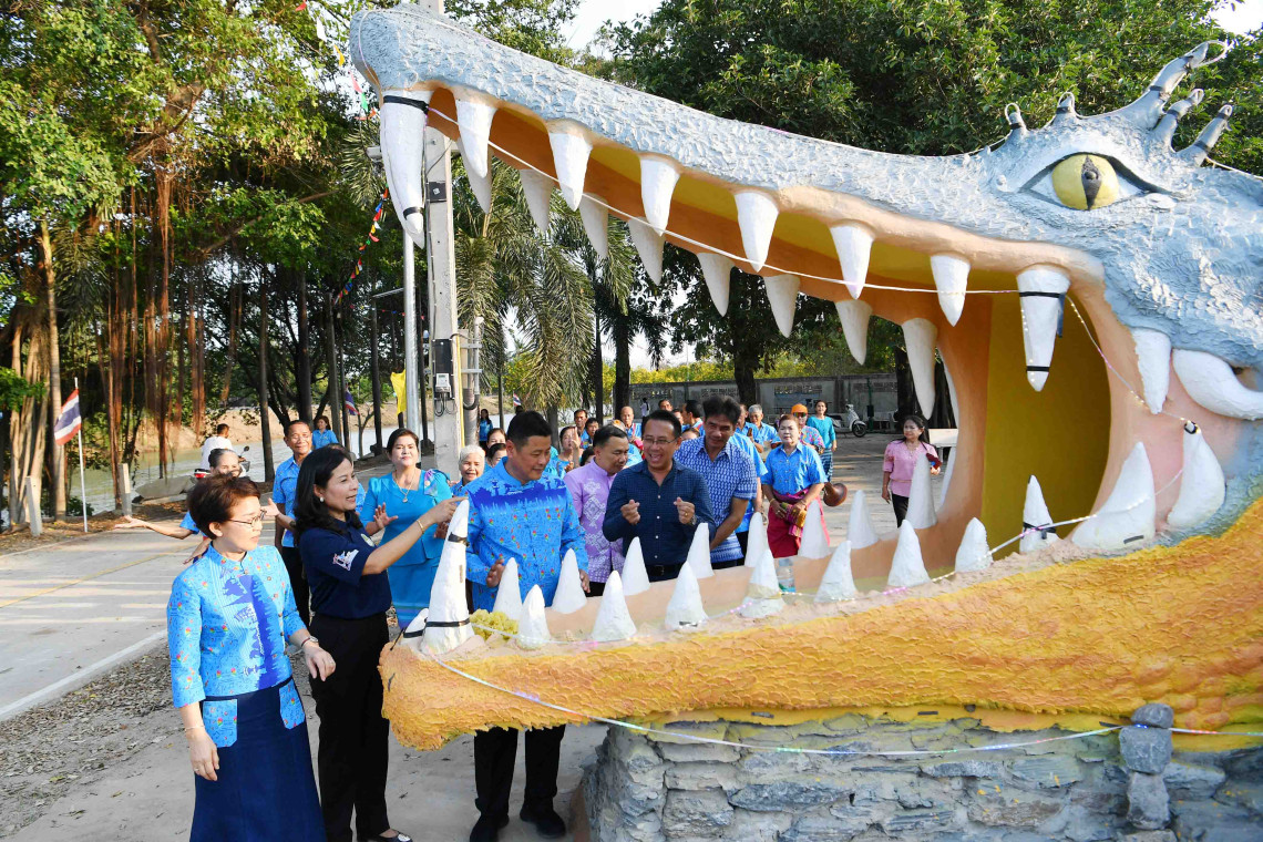 หลังจากการแถลงข่าวเสร็จ ท่านปลัดจังหวัดจังหวัด ท่านนายอำเภอ ได้นำผู้ร่วมแถลงข่าวไปขอโชคลาภกับจระเข้ โดยคณะกลองยาวได้แห่เดินจากจุดแถลงข่าวไปที่จรเข้ยักษ์ ระยะทางประมาณ 300 เมตรเพื่อขอโชคลาภ เมื่อไปถึงบางคนถูฟันจระเข้ บางคนนับจำนวนฟันจรเข้ ส่วนใหญ่ต่างนับฟันจรเข้ ได้จำนวนที่แตกต่างกันไป เช่นท่านปลัดจังหวัดนับได้ 46 ซี่ ส่วนคุณพชรพรรณ พร้อมคุณนายท่านปลัดจังหวัดและนางรำนับได้ 44 ซี่เมื่อได้ตัวเลขแล้วคณะก็ได้แยกย้ายพร้อมจดตัวเลขเสี่ยงดวงกันในวันที่ 1 เมษายนนี้
