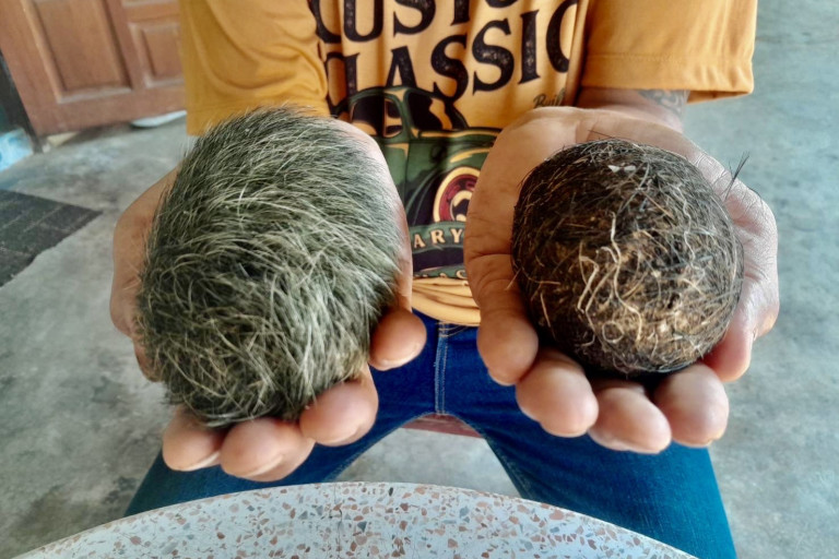ต่อมาผู้สื่อข่าวได้เดินทางไปพบกับเจ้าของอวกหมูป่าทราบชื่อนายธนยศ (หนึ่ง)ฉิมพาลี อายุ 51 ปี 9/6 มา.4 ตรง.แหลมบัว อ.นครชัยศรี จ.นครปฐม ได้เล่าให้ฟังว่าที่บ้านมีอ้วกหมูป่าจะเป็นก้อนทรงวงลีออกสีดำซึ่งที่ได้มาช่วงแรกมีอาชีพชะแระหมูขายช่วงประมาณปี 2559 ตนเองไปชื้อหมูป่ามาจากบ้านหมู่ใหญ่บ้านแถวตำบลท่าตำหนัก อำเภอนครชัยศรีและนำมาชำแระเนื้อขาย เมื่อทำหมูป่าและจะล้างเครื่องในและพบก้อนอ้วกอยู่ในถุงน้ำดีซึ่งช่วงแรกจะไม่รู้ว่าคืออะไรแต่ก็มีคนงานที่มาช่วยทำหมูเป็นคนกัมพูชามาขอโดยบอกว่าอยากได้ ซึ่งตนเองก็ไม่ทราบว่าเป็นอะไร แต่พอเอามาตรวจสอบพบว่ามีใหญ่เท่าฝ่ามือหนักประมาณ 1 กิโลกรัม และไม่ได้ยกให้ใคร จากนั้นได้นำไปล้างน้ำมาใส่จานตั้งไว้ให้แห้งและเอามาเก็บบูชา