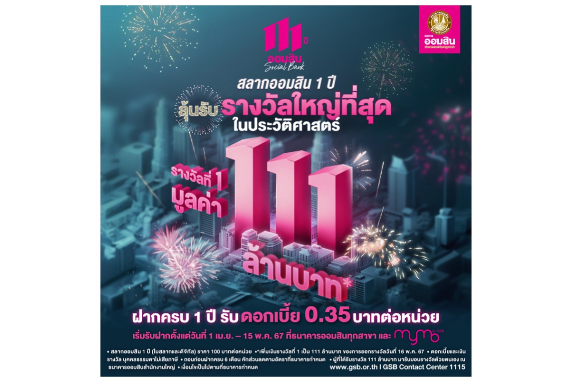 ธนาคารออมสิน ออกแคมเปญฉลองในวาระวันคล้ายวันสถาปนาธนาคารออมสินครบรอบ 111 ปี กับสลากออมสินพิเศษ 1 ปี แจกรางวัลที่ 1 มูลค่า 111 ล้านบาท เริ่มเปิดรับวันที่ 1 เม.ย. 67 ถึงวันที่ 15 พ.ค 67