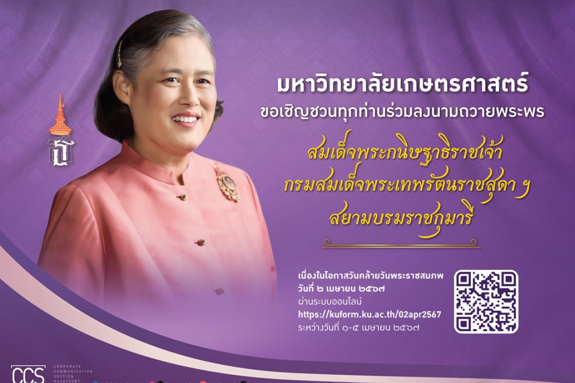 ด้วยสำนึกในพระมหากรุณาธิคุณ สมเด็จพระกนิษฐาธิราชเจ้า กรมสมเด็จพระเทพรัตนราชสุดา เจ้าฟ้ามหาจักรีสิรินธร มหาวชิราลงกรณวรราชภักดีสิริกิจการิณีพีรยพัฒน รัฐสีมาคุณากรปิยชาติ สยามบรมราชกุมารี เนื่องในโอกาสวันคล้ายวันพระราชสมภพ วันที่ 2 เมษายน 2567 มหาวิทยาลัยเกษตรศาสตร์ ขอเชิญประชาชน ร่วมลงนามถวายพระพร ผ่านระบบออนไลน์ ได้ที่ https://kuform.ku.ac.th/02apr2567 ตั้งแต่วันที่ 1-5 เมษายน 2567 พัฒนาระบบถวายพระพรออนไลน์โดย สำนักบริการคอมพิวเตอร์ มหาวิทยาลัย เกษตรศาสตร์