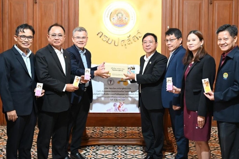 นายสัตวแพทย์สมชวน รัตนมังคลานนท์ อธิบดีกรมปศุสัตว์ พร้อมด้วย ข้าราชการระดับสูงและเจ้าหน้าที่กรมปศุสัตว์ รับมอบผลิตภัณฑ์กำจัดเห็บหมัดภายนอกตัวสุนัขและแมว แบบหยดหลัง จำนวน 50,000 โดส จาก นายสัตวแพทย์กมล รัตนตยารมณ์ ประธานเจ้าหน้าที่บริหาร บริษัท ไทยนาโอกะ ฟาร์มาซูติคอล จำกัด ร่วมกับ นายสัตวแพทย์ปราโมทย์ ตาฬวัฒน์ นายกสัตวแพทยสมาคมแห่งประเทศไทย ในพระบรมราชูปถัมภ์ เพื่อนำไปใช้ในกิจกรรมควบคุม ป้องกันโรคพิษสุนัขบ้า ที่เป็นสาเหตุให้คนไทยเสียชีวิต 100-1,000 คนต่อปี ให้หมดไปภายในปี 2570 ณ กรมปศุสัตว์ พญาไท