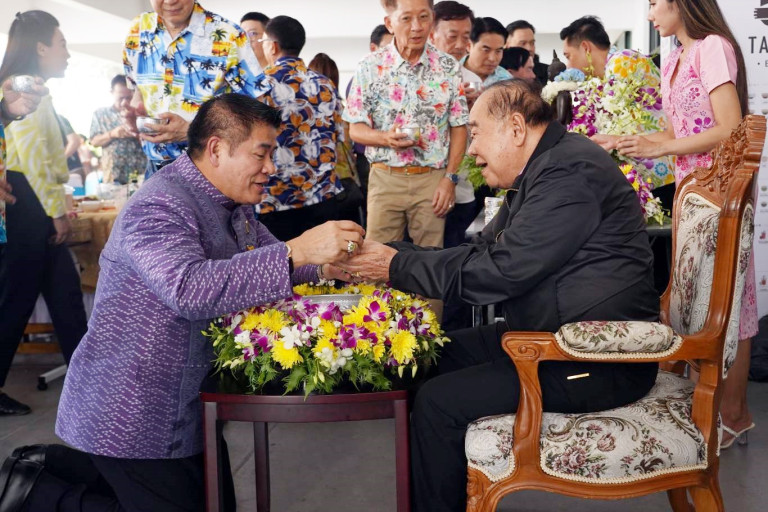สมาชิก พปชร.ร่วมขอพร-รับพร รดน้ำ "บิ๊กป้อม" เนื่องในวันสงกรานต์ พร้อมใจสร้างสีสันใส่เสื้อลายดอกยกทีม เพิ่มบรรยากาศความอบอุ่นเป็นกันเอง