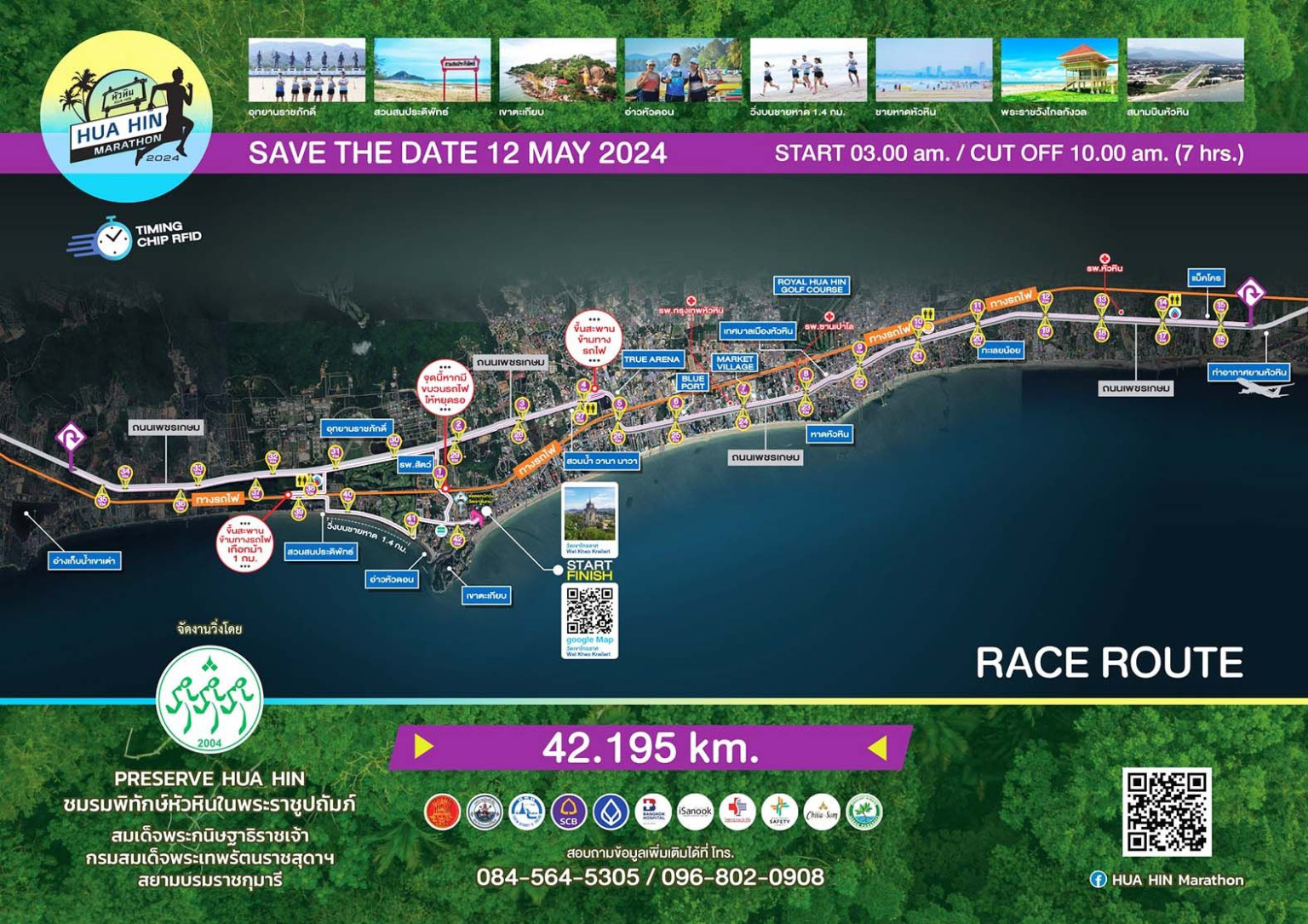 โดยแบ่งการแข่งขันออกเป็น 4 ระยะทาง ได้แก่ Marathon 42.195 ก.ม. ชิงถ้วยพระราชทาน โอเวอร์ออล สมเด็จพระกนิษฐาธิราชเจ้า กรมสมเด็จพระเทพรัตนราชสุดาฯ สยามบรมราชกุมารี ประเภทชาย 1 รางวัล และประเภทหญิง 1 รางวัล / Half Marathon 21 ก.ม. / Mini Marathon 10.5 และ Fun Run 5 ก.ม. จัดขึ้นในวันอาทิตย์ที่ 12 พ.ค.67 เวลา 03.00 - 11.00 น. จุดสตาร์ทบริเวณวัดเขาไกรลาศ อ.หัวหิน ผ่านเส้นทางเมืองหัวหินสุดคลาสสิคและชายหาดหัวหินสุดชิล เปิดรับสมัครในทุกระยะการแข่งขันถึงปลายเดือนเมษายนนี้ ทั้ง Marathon / Half Marathon / Mini Marathon และ Funrun ผู้สมัครจะได้เสื้อวิ่งใส่สบายที่ออกแบบภาพป่าชายเลน วัดเขาไกรลาศ และเหรียญที่ระลึก "หัวหินมาราธอน" ทรง 9 เหลี่ยม ที่สวยงามทรงคุณค่าไปครอบครอง ผู้ที่สนใจสามารถดูรายละเอียดได้ที่ https://www.runlah.com/events/huahin2024