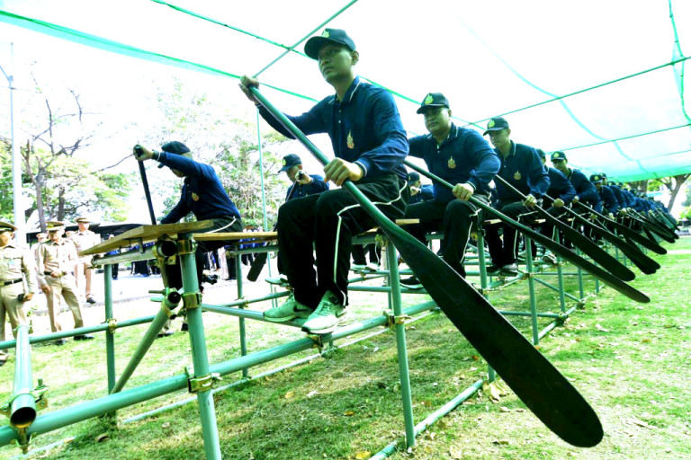 รองเสนาธิการทหารเรือ ตรวจเยี่ยมกำลังพลฝีพายเรือพระราชพิธี ที่อยู่ระหว่างการฝึกบนเขียงฝึก