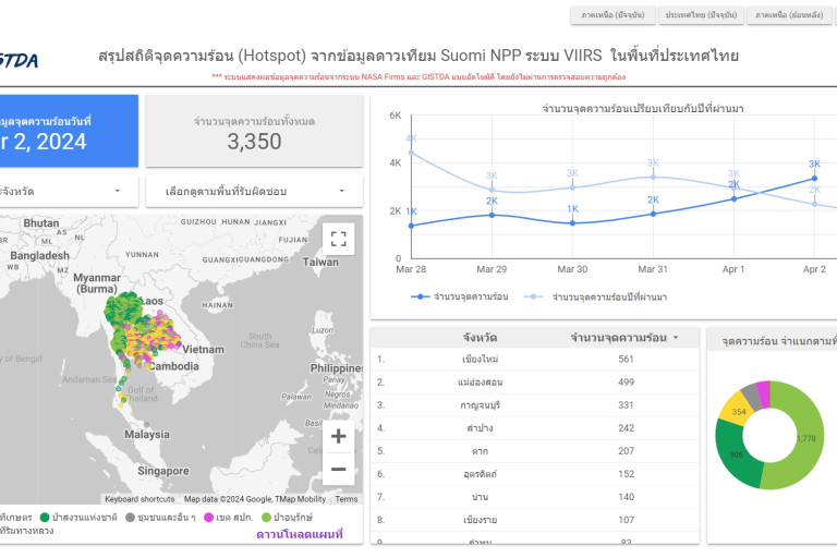 กระทรวงการอุดมศึกษา วิทยาศาสตร์ วิจัยและนวัตกรรม (อว.) โดยสำนักงานพัฒนาเทคโนโลยีอวกาศและภูมิสารสนเทศ (องค์การมหาชน) หรือ GISTDA เผยข้อมูลจากดาวเทียมซูโอมิ เอ็นพีพี (Suomi NPP) และจากดาวเทียมอีกหลายดวง เมื่อวันที่ 2 เมษายน 2567 ไทยพบจุดความร้อนทั้งประเทศ 3,350 จุด ข้อมูลจากดาวเทียมยังระบุอีกว่าจุดความร้อนที่เกิดขึ้นส่วนใหญ่พบในพื้นที่ป่าอนุรักษ์ 1,778 จุด ตามด้วยพื้นที่ป่าสงวน 906 จุด พื้นที่เกษตร 354 จุด แหล่งชุมชนและอื่นๆ 168 จุด พื้นที่ สปก. 129 จุด รวมถึงพื้นที่ริมทางหลวง 15 จุด สำหรับจังหวัดที่พบจำนวนจุดความร้อนมากที่สุด คือ #เชียงใหม่ 561 จุด