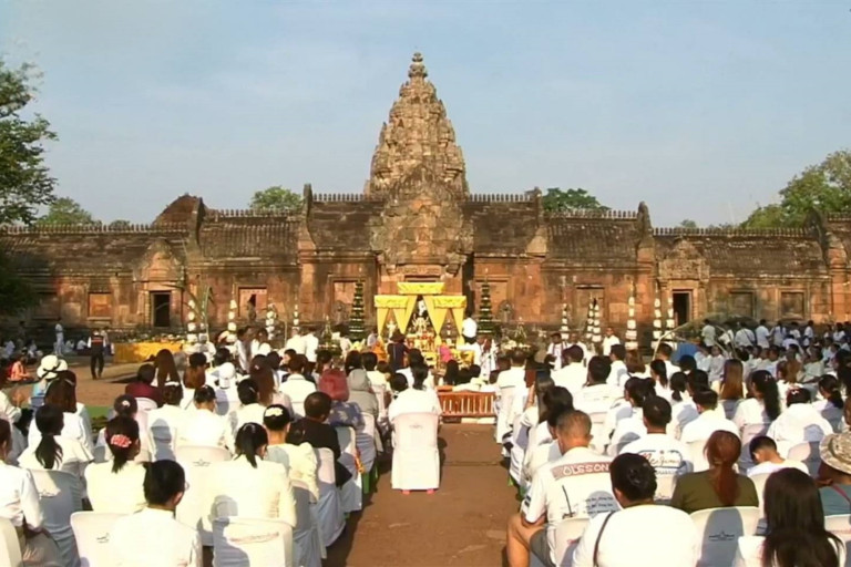 ผู้ว่าฯ บุรีรัมย์ นำส่วนราชการ พ่อค้า ประชาชน และนักท่องเที่ยว ประกอบพิธีบวงสรวงองค์พระศิวะมหาเทพ สิ่งศักดิ์สิทธิ์บนยอดเขาพนมรุ้ง เพื่อความเป็นสิริมงคล จัดงานประเพณีขึ้นเขาพนมรุ้ง ชมการแสดงแสง สี เสียง “มหัศจรรย์พนมรุ้ง” ชมริ้วขบวนเสด็จของพระนางภูปตินทรลักษมีเทวี แสดงโดย “อแมนด้า ออบดัม”, “แต้ว ณฐพร” และ “ญดา นริลญา” ขบวนรำสักการะ“น้อมจิตบังคม พนมรุ้งนาฏการ” นางรำกว่า 1,000 จากทุกอำเภอ รำถวายสักการะใต้ร่มพนมรุ้ง การแสดงศิลปวัฒนธรรมพื้นบ้าน และร่วมอุดหนุนสินค้าพื้นบ้าน อาหารพื้นถิ่น ใน“ตลาดอารยธรรมวนัมรุง”
