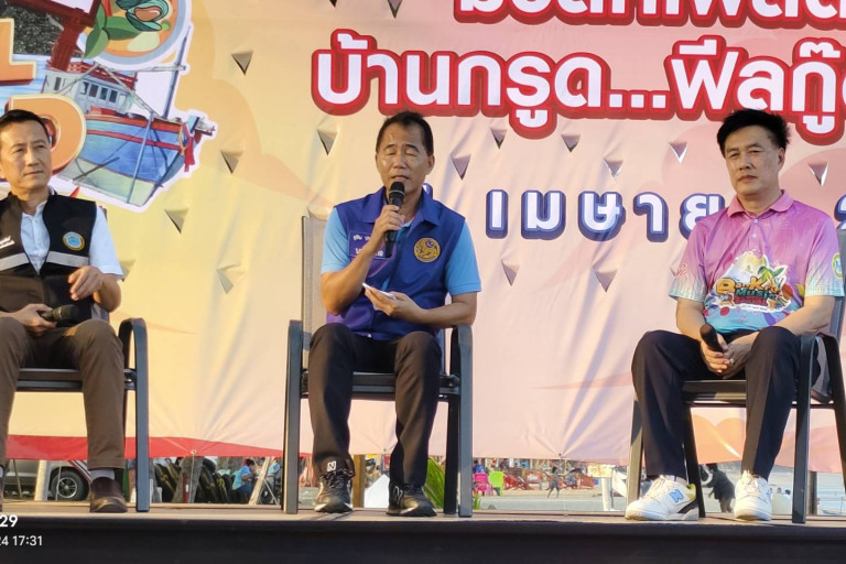 วันที่ 5 เม.ย.67 ที่ชายหาดบ้านกรูด นายสุทิน ประเสริฐศักดิ์ นายอำเภอบางสะพาน นายอิสรา กาญจนรัตน์ นายกเทศบาลตำบลบ้านกรูด นายสราวุธ ลิ้มอรุณรักษ์ นายกองค์การบริหารส่วนจังหวัดประจวบคีรีขันธ์ นายดำรงค์ มากระจัน พัฒนาการจังหวัดประจวบฯ นายอาชวันต์ กงกะนันทน์ ผู้อำนวยการ การท่องเที่ยวแห่งประเทศไทย สำนักงานประจวบคีรีขันธ์ ร่วมกันแถลงข่าว จัดเทศกาลสงกรานต์ มิวสิคเพสติวัล บ้านกรูด ฟิลกู๊ด2024