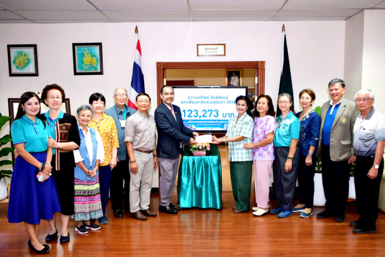 วันที่ 5 เม.ย.67 ดร.จงรัก วัชรินทร์รัตน์ อธิการบดีมหาวิทยาลัยเกษตรศาสตร์ รับมอบเงินบริจาคเพื่อสนับสนุนคณะแพทยศาสตร์และโรงพยาบาลมหาวิทยาลัยเกษตรศาสตร์ จากอาจารย์ทิพย์ ชัยพิพัฒน์ พันโท ทันตแพทย์หญิงอังศิกา กุศลาสัย และเพื่อนสาธิตสวนสุนันทา 2510 รวมเป็นเงินจำนวน 123,237 บาท ทั้งนี้ ในจำนวนเงินดังกล่าว พันโท ทันตแพทย์หญิงอังศิกา กุศลาสัย ได้ร่วมบริจาคผ่านการประมูลภาพเขียนของอาจารย์ทิพย์ ชัยพิพัฒน์ เป็นเงินจำนวน 100,000 บาท โอกาสนี้ ดร.ดำรงค์ ศรีพระราม รองอธิการบดีฝ่ายบริหาร และคณะกรรมการดำเนินการชมรม มก.อาวุโส ร่วมเป็นสักขีพยาน ณ อาคารสารนิเทศ 50 ปี มหาวิทยาลัยเกษตรศาสตร์