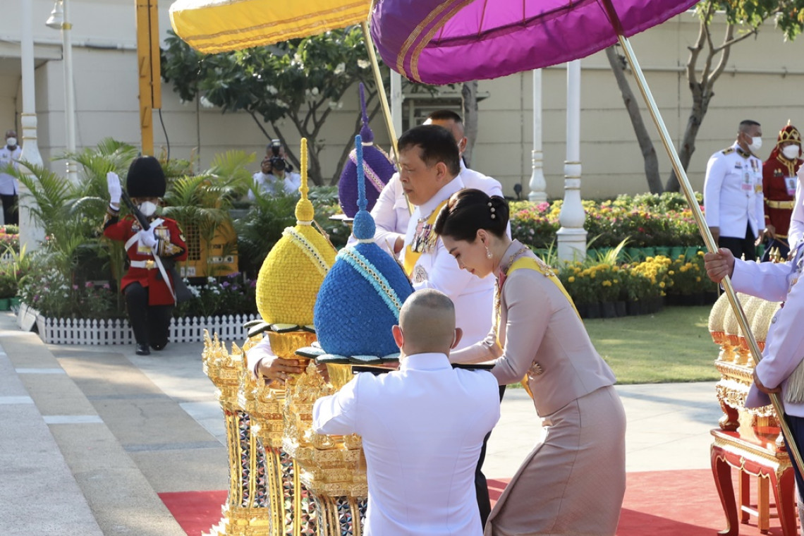 จากนั้น ประทับรถยนต์พระที่นั่ง เสด็จพระราชดำเนินไปยัง วัดพระศรีรัตนศาสดาราม และปราสาทพระเทพบิดร พระบรมมหาราชวัง เมื่อเสด็จพระราชดำเนินถึงพระอุโบสถวัดพระศรีรัตนศาสดาราม พระบาทสมเด็จพระเจ้าอยู่หัว เสด็จพระราชดำเนินไปที่ฐานชุกชี ทรงวางกระทงดอกไม้บนพานหน้าฐานชุกชี ทรงจุดธูปเทียนเครื่องนมัสการ ท้ายที่นั่ง แล้วทรงจุดเทียนห่วงบูชาพระพุทธมหามณีรัตนปฏิมากร ทรงจุดธูปเทียนเครื่องนมัสการท้ายที่นั่งบูชา พระพุทธยอดฟ้าจุฬาโลกย์ และพระพุทธเลิศหล้านภาไลย แล้วทรงจุดธูปเทียนเครื่องนมัสการทองใหญ่ที่หน้าธรรมาสน์ศิลา สมเด็จพระนางเจ้า ฯ พระบรมราชินี ทรงจุดธูปเทียนเครื่องนมัสการทองทิศที่หน้าธรรมาสน์ศิลา