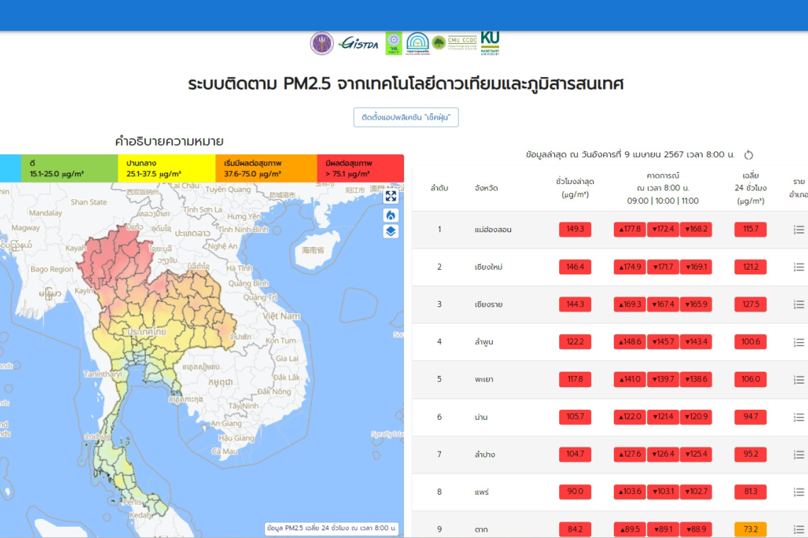 กระทรวงการอุดมศึกษา วิทยาศาสตร์ วิจัยและนวัตกรรม (อว.) โดยสำนักงานพัฒนาเทคโนโลยีอวกาศและภูมิสารสนเทศ (องค์การมหาชน) หรือ GISTDA ร่วมกับสำนักงานการวิจัยแห่งชาติ, กรมควบคุมมลพิษ, มหาวิทยาลัยเกษตรศาสตร์ และมหาวิทยาลัยเชียงใหม่ เกาะติดสถานการณ์ฝุ่น PM 2.5 แบบรายชั่วโมง ด้วยข้อมูลจากดาวเทียมผ่านแอปพลิเคชั่น “เช็คฝุ่น” เมื่อเวลา 08.00 น. ของวันที่ 9 เมษายน 2567 พบ 12 จังหวัดทางภาคเหนือ มีค่าฝุ่นเกินเกณฑ์มาตรฐานในระดับสีแดง ที่มีผลกระทบต่อสุขภาพและระบบทางเดินหายใจ ได้แก่ #แม่ฮ่องสอน 149.3 ไมโครกรัม #เชียงใหม่ 146.4 ไมโครกรัม #เชียงราย 144.3 ไมโครกรัม #ลำพูน 122.2 ไมโครกรัม #พะเยา 117.8 ไมโครกรัม #น่าน 105.7 ไมโครกรัม #ลำปาง 104.7 ไมโครกรัม #แพร่ 90 ไมโครกรัม #ตาก 84.2 ไมโครกรัม #เลย 83.1 ไมโครกรัม #สุโขทัย 81.3 ไมโครกรัม #อุตรดิตถ์ 81.1 ไมโครกรัม ในขณะที่อีก 18 จังหวัดมีค่าเกินมาตรฐานในระดับสีส้ม ที่เริ่มมีผลต่อสุขภาพและระบบทางเดินหายใจ