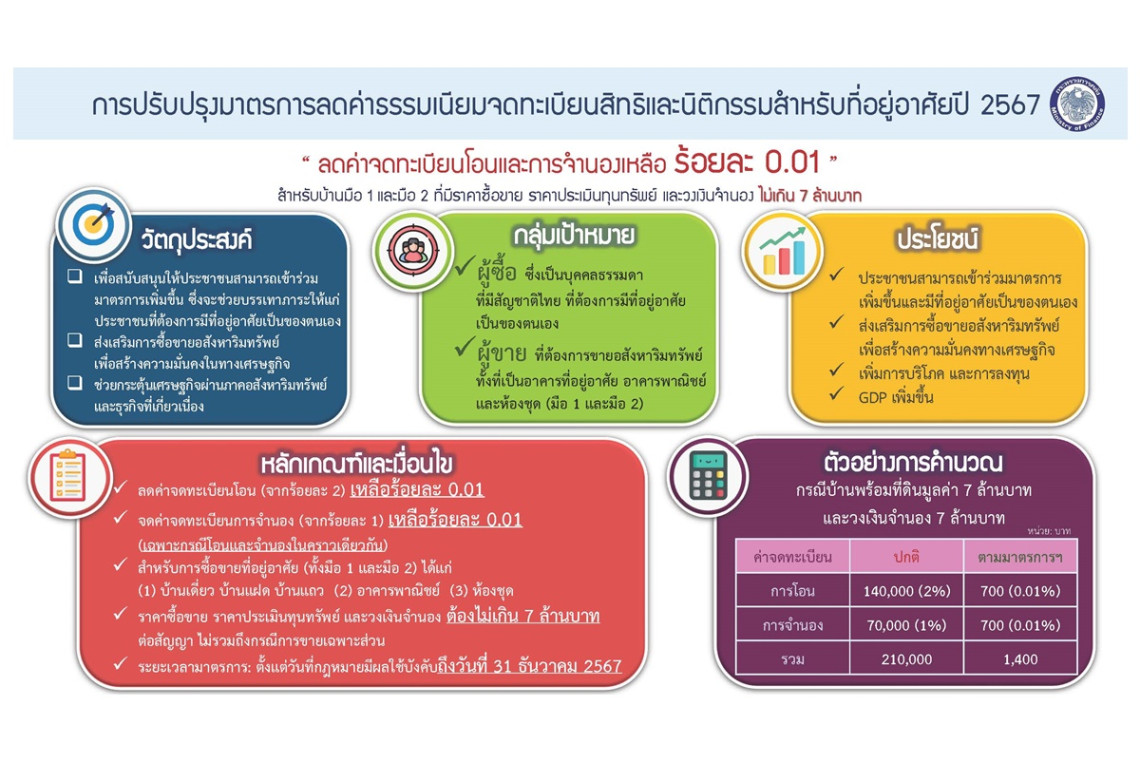 1.การปรับปรุงมาตรการลดค่าธรรมเนียมจดทะเบียนสิทธิและนิติกรรมสำหรับที่อยู่อาศัย ปี 2567โดยลดค่าจดทะเบียนโอนอสังหาริมทรัพย์จากร้อยละ 2 เหลือร้อยละ 0.01 และลดค่าจดทะเบียนการจำนอง อสังหาริมทรัพย์จากร้อยละ 1 เหลือร้อยละ 0.01 เฉพาะที่จดทะเบียนโอนในคราวเดียวกัน สำหรับการซื้อขาย อสังหาริมทรัพย์ ได้แก่ อาคารที่อยู่อาศัยประเภทบ้านเดี่ยว บ้านแฝด หรือบ้านแถว หรืออาคารพาณิชย์ หรือที่ดินพร้อมอาคารดังกล่าว หรือห้องชุดที่จดทะเบียนอาคารชุด โดยมีราคาซื้อขายและราคาประเมินทุนทรัพย์ไม่เกิน 7 ล้านบาท และวงเงินจำนองไม่เกิน 7 ล้านบาท ต่อสัญญา โดยไม่รวมถึงกรณีการขายเฉพาะส่วน ทั้งนี้ สำหรับผู้ซื้อที่เป็นบุคคลธรรมดาสัญชาติไทย โดยให้มีผลใช้บังคับตั้งแต่วันที่กฎหมายได้ประกาศในราชกิจจานุเบกษาถึงวันที่ 31 ธันวาคม 2567