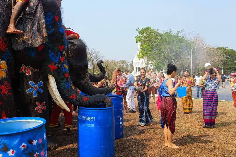 วันที่ 9 เมษายน 2567 ว่าที่ร้อยตรีสมทรง สรรพโกศลกุล นายกเทศมนตรีนครพระนครศรีอยุธยา นายณัฐปคัลภ์ อัครวิชญ์ ผู้อำนวยการ ททท.สำนักงานพระนครศรีอยุธยา นายมานัส ทรัพย์มีชัย ประธานสภาอุตสาหกรรมท่องเที่ยวจังหวัดพระนครศรีอยุธยา ร่วมกันเล่นน้ำสงกรานต์ ประเดิมเทศกาลสงกรานต์ประจำปี 2567 “อยุธยามหาสงกรานต์ สนุก สุข ศักดิ์สิทธิ์” โดยมี นายลายทองเหรียญ มีพันธุ์ ผู้อำนวยการวังช้างอยุธยา แล เพนียด พร้อมควาญช้างได้นำช้างแสนรู้ จำนวน 10 เชือก เพ้นท์สีวาดลวดลายดอกไม้ บนตัวช้างเพ้นท์ระบายสีวาดลาดลายสงกรานต์อย่างสวยงามออกมาเล่นพ่นสาดน้ำสงกรานต์กัน ที่วงเวียนศาลหลักเมืองอยุธยากันอย่างคึกคักเย็นฉ่ำ ทำให้อากาศที่ร้อนอบอ้าวได้คลายร้อนขึ้นมาทันที ส่งสัญญาณสงกรานต์อยุธยาเริ่มขึ้นแล้ว เตรียมความพร้อมสำหรับนักท่องเที่ยวที่จะมาสาดน้ำเล่นน้ำกับช้างแสนรู้