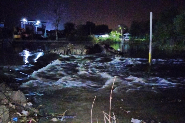 วันที่ 9 เม.ย.67 เวลา 19.30 น. ผู้สื่อข่าวรายงานว่า ได้เกิดเหตุทำนบดินในพื้นที่โครงการก่อสร้างประตูระบายน้ำท่าถั่ว ซึ่งอยู่ใกล้กับปากคลองประเวศบุรีรมย์ ตั้งอยู่ในพื้นที่ ต.บางกรูด อ.บ้านโพธิ์ จ.ฉะเชิงเทรา พังทลายลง จนทำให้น้ำเค็มในแม่น้ำบางปะกง ซึ่งขณะนี้มีค่าความเค็มสูงถึงกว่า 25 กรัมต่อลิตรไหลทะลักเข้าไปยังภายในลำคลองประเวศฯ ซึ่งเชื่อมต่อไปยังพื้นที่ กทม. และคลองสาขาอีกจำนวนมากที่ต้องการใช้น้ำจืด