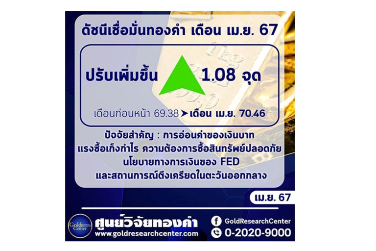 นายพิบูลย์ฤทธิ์ วิริยะผล ผู้อำนวยการศูนย์วิจัยทองคำ เผยดัชนีความเชื่อมั่นราคาทองคำประจำเดือน เม.ย.67 อยู่ที่ 70.46 จุด เพิ่มขึ้น 1.08 จุด หรือคิดเป็น 1.56% จาก 69.38 จุดในเดือน มี.ค.67 โดยมีปัจจัยหนุนจากการอ่อนค่าของเงินบาท, แรงซื้อเก็งกำไร, ความต้องการซื้อสินทรัพย์ปลอดภัย, นโยบายทางการเงินของธนาคารกลางสหรัฐฯ (เฟด) และสถานการณ์ตึงเครียดในตะวันออกกลาง