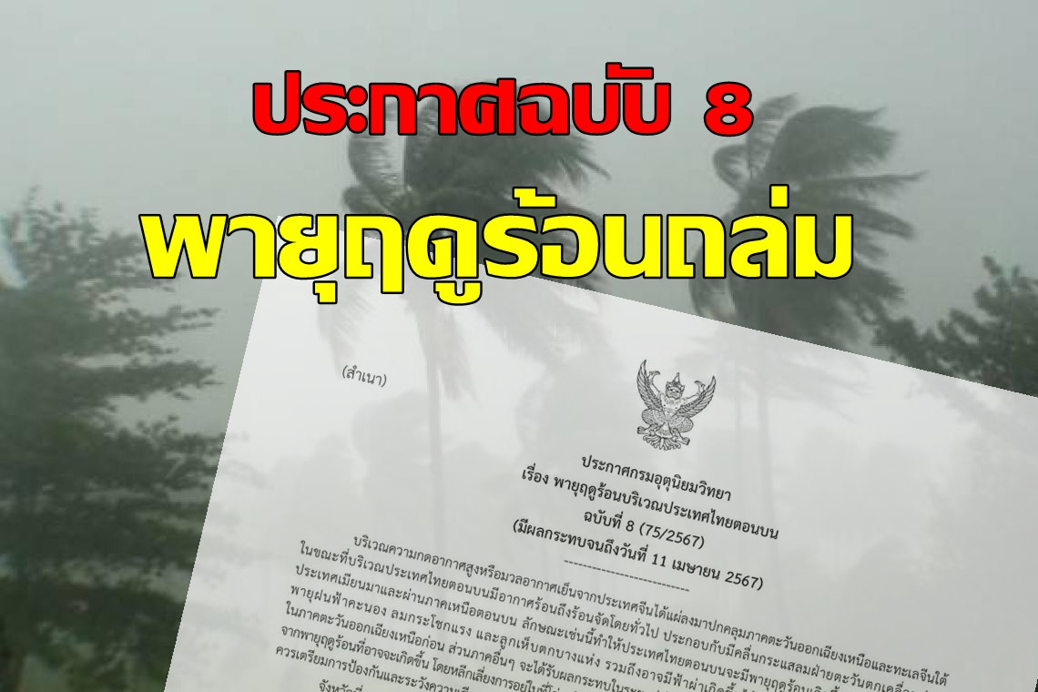 วันที่ 10 เมษายน พ.ศ. 2567 ออกประกาศกรมอุตุนิยมวิทยา เรื่อง พายุฤดูร้อนบริเวณประเทศไทยตอนบน ฉบับที่ 8 (75/2567) (มีผลกระทบจนถึงวันที่ 11 เมษายน 2567) ความว่า บริเวณความกดอากาศสูงหรือมวลอากาศเย็นจากประเทศจีนได้แผ่ลงมาปกคลุมภาคตะวันออกเฉียงเหนือและทะเลจีนใต้ ในขณะที่บริเวณประเทศไทยตอนบนมีอากาศร้อนถึงร้อนจัดโดยทั่วไป ประกอบกับมีคลื่นกระแสลมฝ่ายตะวันตกเคลื่อนผ่านเมียนมาและผ่านภาคเหนือตอนบน ลักษณะเช่นนี้ทำให้ประเทศไทยตอนบนจะมีพายุฤดูร้อนเกิดขึ้น โดยมีลักษณะของพายุฝนฟ้าคะนอง ลมกระโชกแรง และลูกเห็บตกบางแห่ง รวมถึงอาจมีฟ้าผ่าเกิดขึ้นได้บางพื้นที่ โดยจะเริ่มมีผลกระทบ