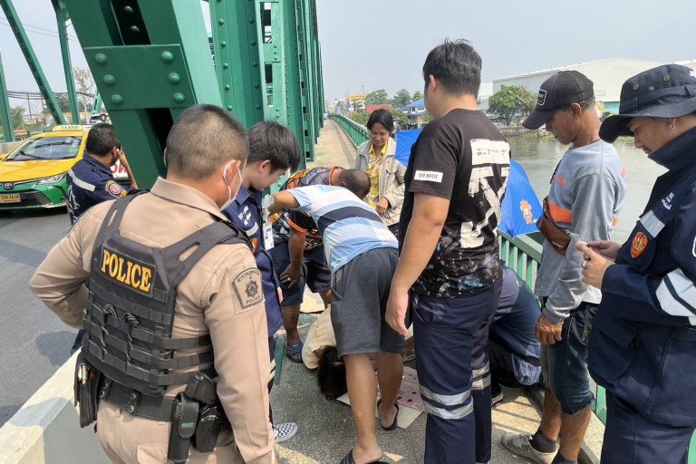 เมื่อวันที่ 11 เม.ย. 67 ด.ต.เวนิตร นามราช อายุ 51 ปี ผบ.หมู่งานป้องกันปราบปราม สภ.ปากเกร็ด และส.ต.อ.จิตรกร วินทะไชย อายุ 27 ปี ผบ.หมู่งานป้องกันปราบปราม ได้รับแจ้งจากศูนย์วิทยุ สภ.ปากเกร็ด ว่ามีหญิงพยายามจะกระโดดสะพานนนทบุรี ต.บ้านใหม่ อ.ปากเกร็ด จ.นนทบุรี จึงรีบไปตรวจสอบ พร้อมด้วยเจ้าหน้าที่กู้ภัยมูลนิธิป่อเต็กตึ้ง