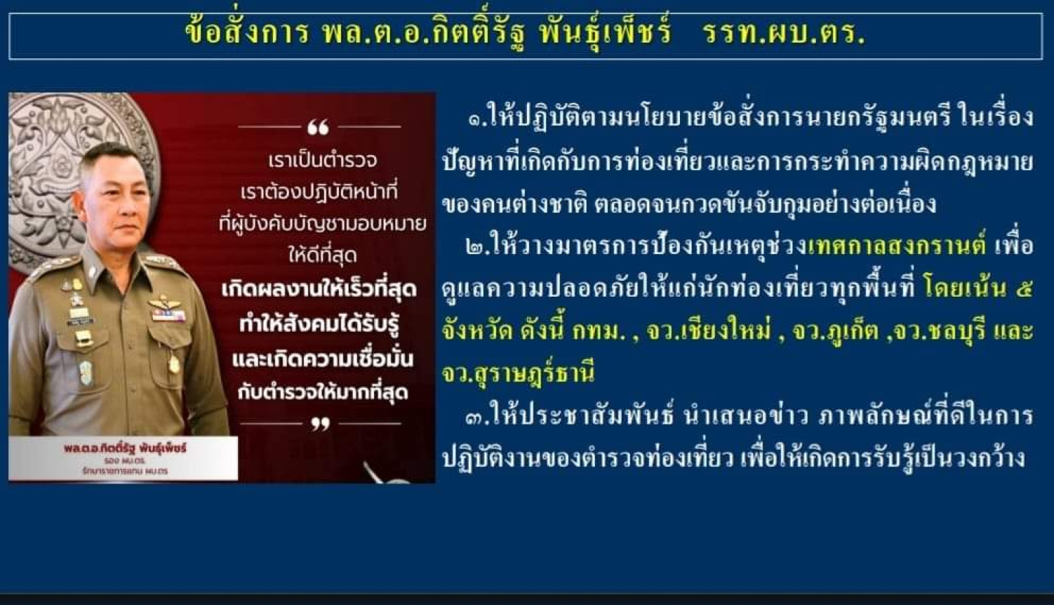 สำนักงานตำรวจแห่งชาติโดย พล.ต.อ.กิตติ์รัฐ พันธุ์เพชร รองผู้บัญชาการตำรวจแห่งชาติ/ รรท.ผบ.ตร. เปิดเผยว่าตามนโยบายเรื่องกระตุ้นเศรษฐกิจสร้างรายได้จากการท่องเที่ยวของรัฐบาล และข้อสั่งการ 11 ข้อของนายกมนตรี จึงได้สั่งการให้ตำรวจทุกหน่วย วางมาตร