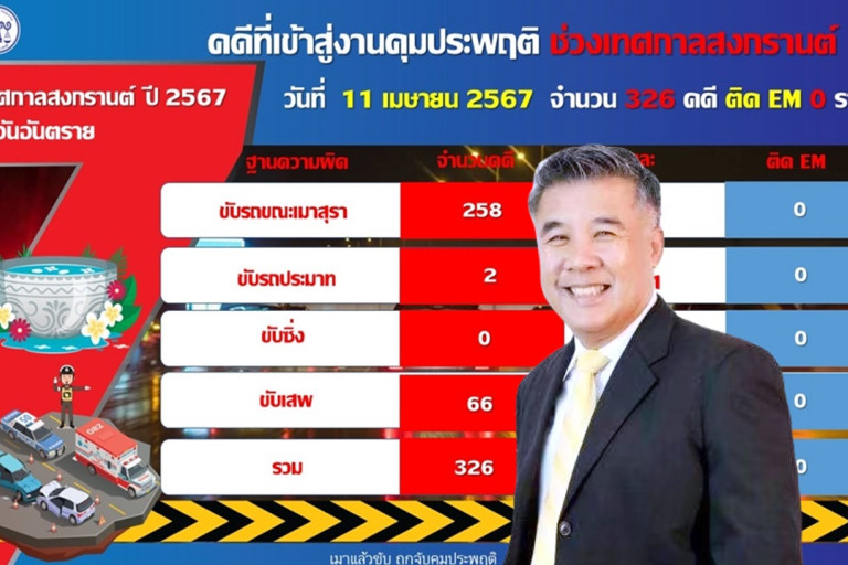 วันที่ 12 เม.ย.67 นายเรืองศักดิ์ สุวารี อธิบดีกรมคุมประพฤติ เปิดเผยถึงสถิติคดีที่ศาลสั่งคุมความประพฤติวันที่ 11 เมษายน 2567 วันแรกของการรณรงค์ป้องกันและลดอุบัติเหตุในช่วงเทศกาลสงกรานต์ 2567 มีคดีทั้งสิ้น 326 คดี จำแนกเป็น คดีขับรถขณะเมาสุรา 258 คดี คิดเป็นร้อยละ 79.14 คดีขับรถประมาท 2 คดี คิดเป็นร้อยละ 0.61 และคดีขับเสพ 66 คดี คิดเป็นร้อยละ 20.25 เมื่อเปรียบเทียบคดีขับรถขณะเมาสุราในเทศกาลสงกรานต์ 2566 มีจำนวน 241 คดี กับสงกรานต์ 2567 จำนวน 258 คดี พบว่า เพิ่มขึ้น 17 คดี คิดเป็นร้อยละ 7.05 สำหรับจังหวัดที่มีสถิติคดีขับรถขณะเมาสุราสูงสุด 3 อันดับ ได้แก่ กรุงเทพมหานคร 60 คดี สมุทรปราการ 29 คดี และ กำแพงเพชร 28 คดี
