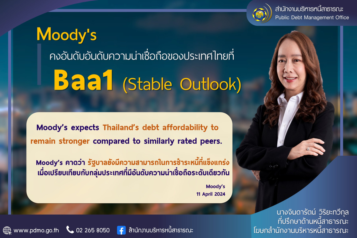 นางจินดารัตน์ วิริยะทวีกุล ที่ปรึกษาด้านหนี้สาธารณะ โฆษกสำนักงานบริหารหนี้สาธารณะ เปิดเผยว่า บริษัท Moody’s Investors Service (Moody’s) ได้คงอันดับความน่าเชื่อถือของประเทศไทย (Sovereign Credit Rating) ที่ Baa1 หรือเทียบเท่า BBB+ และคงมุมมองความน่าเชื่อถือของประเทศไทยในระดับมีเสถียรภาพ (Stable Outlook) โดยมีสาระสำคัญ ดังนี้