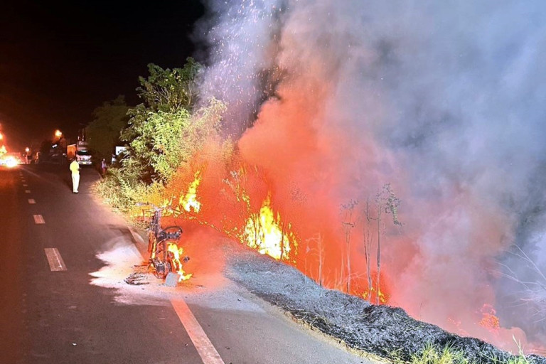 วันที่ 12 เม.ย.67 ผู้สื่อข่าวรายงานว่า เมื่อช่วงเที่ยงคืนเศษของคืนที่ผ่านมา (12 เม.ย.) จากการเปิดเผยของสมาคมกู้ภัยสว่างร่วมใจยโสธรได้รับแจ้งจากศูนย์รับแจ้งเหตุ 191 ของตำรวจภูธรจังหวัดยโสธรว่า มีรถจักรยานยนต์ถูกไฟไหม้โดยเหตุเกิดที่บริเวณไหล่ถนนฝั่งตรงข้ามกับวิทยาลัยเทคนิคยโสธร ตำบลสำราญ อำเภอเมือง จังหวัดยโสธร จึงจัดเจ้าหน้าที่อาสาฯกู้ภัย ออกตรวจสอบตามที่ได้รับแจ้งพอไปถึงที่เกิดเหตุพบเปลวเพลิงกำลังลุกไหม้รถจักรยานยนต์ยี่ห้อยามาฮ่า รุ่น มีโอไม่ทราบหมายเลขทะเบียนซึ่งจอดอยู่ไหล่ทางในลักษณะหันหน้ารถไปทางย้อนศรโดยเปลวไฟได้ไหม้อย่างรุนแรงจนไม่มีใครกลาเข้าใกล้ และได้ลุกลามไปไหม้หญ้าแห้งบริเวณข้างทางอีกอย่างต่อเนื่อง อาสาฯ กู้ภัยจึงได้ใช้ถังสารเคมีดับเพลิง จำนวน 2 ถัง เข้าฉีดพ่นเพื่อดับไฟที่กำลังลุกไหม้รถจักรยานยนต์แต่เพลิงก็ยังไม่สงบและไม่สามารถที่จะดับไฟเอาไว้ได้ จึงได้ขอรับการสนับสนุนรถน้ำดับเพลิงจากเทศบาลเมืองยโสธรและเทศบาลตำบลสำราญ ช่วยนำรถดับเพลิงเข้าช่วยฉีดน้ำดับไฟในที่เกิดเหตุโดยต้องใช้เวลาประมาณ 30 นาที จึงสามารถดับไฟเอาไว้ได้อย่างปลอดภัยแต่ก็ทำให้รถจักรยานยนต์ถูกไฟไหม้จนได้รับความเสียหายทั้งคัน