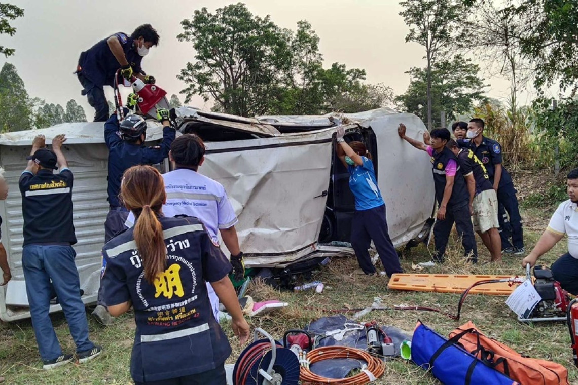 เมื่อช่วงเช้าวันที่ 12 เม.ย.67 ร.ต.อ.ธนงศักดิ์ สำรวมรัมย์ รองสารวัตร สอบสวน สถานีตำรวจภูธรไพรบึง ได้รับแจ้งว่าเกิดเหตุอุบัติเหตุรถกระบะพลิกคว่ำ มีผู้บาดเจ็บหลายราย มีคนติดภายในตัวรถ ที่ถนนสายอำเภอไพรบึง ไปยัง อำเภอขุนหาญ ช่วงบ้านสำโรงพลัน ตำบลสำโรงพลัน อำเภอไพรบึง จังหวัดศรีสะเกษ จึงรีบไปตรวจที่เกิดเหตุพร้อมกับประสานไปยังหน่วยกู้ภัยศรีสะเกษธรรมสถานจุดอำเภอไพรบึง และหน่วยกู้ภัยสว่างจิตต์ศรีสะเกษธรรมสถานจุดอำเภอขุนหาญ ให้ออกไปช่วยดูที่เกิดเหตุ พอไปถึงพบรถยนต์กระบะยี่ห้ออีซูซุ สีขาว 4 ประตู พลิกตะแคงข้างสภาพพังยับเยิน มีคนเจ็บหลายราย และมีคนติดอยู่ภายในรถยนต์ เจ้าหน้าที่หน่วยกู้ภัยพยายามช่วยกันใช้เครื่องตัดถ่างงัดร่างผู้บาดเจ็บออกมาจากตัวรถ