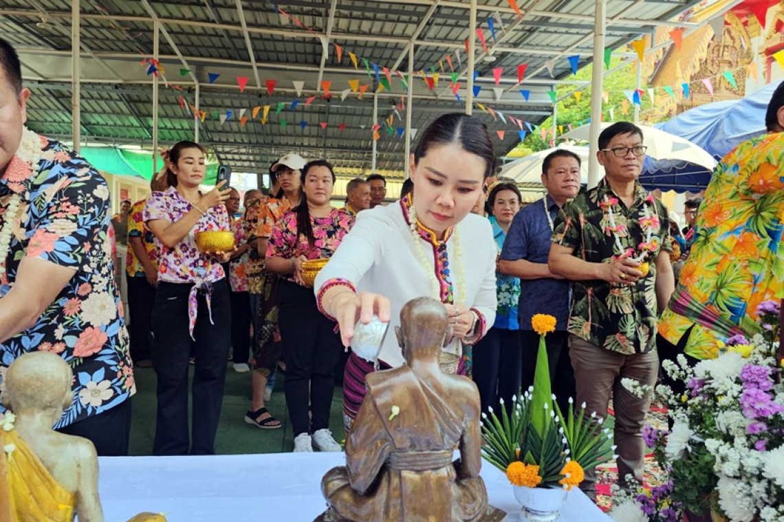 ทั้งนี้ พระครูสิริพัฒนนิเทศ นำคณะพุทธศาสนิกชนยกผ้าอังสะผืนใหญ่ขึ้นเหนือศรีษะเดินเป็นริ้วขบวนจากศาลาเอนกประสงค์ขึ้นสู่ลานธรรมมรรค 8 ที่ประดิษฐานพระพรหมภูมิปาโล พร้อมสวดมนต์บทสรรเสริญ พระพุทธคุณ พระธรรมคุณและพระสังฆคุณ บรรยากาศที่อิ่มบุญอิ่มใจเสริมสิริมงคลต้อนรับปีใหม่ไทยในช่วงเทศกาลสงกรานต์