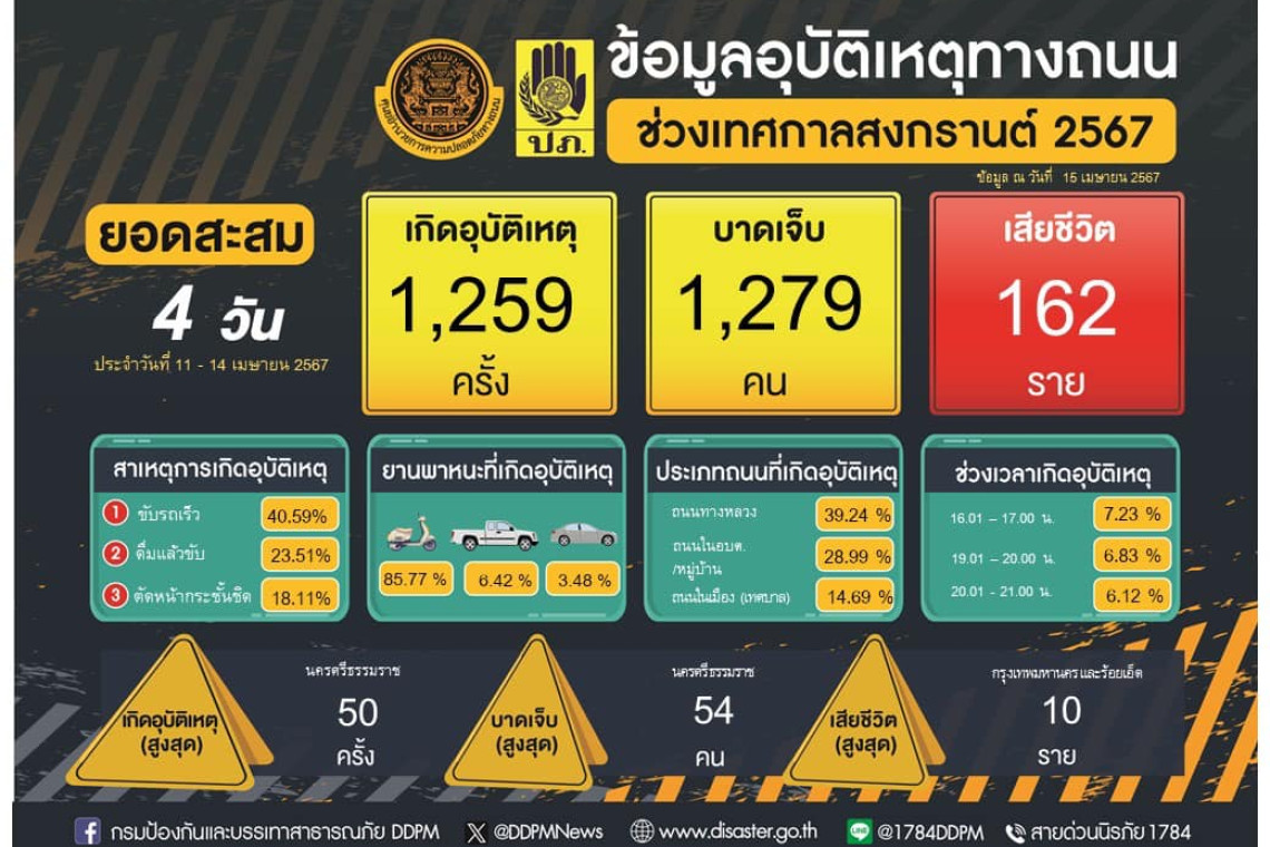 4 วันสงกรานต์! เสียชีวิตพุ่ง 162 ศพ บาดเจ็บ 1,279 ราย เกิดอุบัติเหตุ 1,259 ครั้ง “กรุงเทพฯ-ร้อยเอ็ด” จูงมือเสียชีวิตเยอะที่สุด “ศปถ.”กำชับคุมเข้มเริ่มเดินทางกลับเข้ากรุงเทพ-จังหวัดพื้นที่ทางเศรษฐกิจ เผยยอดลดลงจากปีที่แล้ว