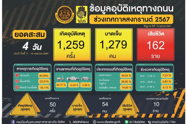 ที่กรมป้องกันและบรรเทาสาธารณภัย (ปภ.) เมื่อวันที่ 15 เมษายน 67 พล.ต.ท.กรไชย คล้ายคลึง ผู้ช่วยผู้บัญชาการตำรวจแห่งชาติ ในฐานะประธานแถลงผลการดำเนินงานของศูนย์อำนวยการป้องกันและลดอุบัติเหตุทางถนนช่วงเทศกาลสงกรานต์ พ.ศ.2567 เปิดเผยว่า ศูนย์อำนวยการป้องกันและลดอุบัติเหตุทางถนนช่วงเทศกาลสงกรานต์ พ.ศ.2567 ได้รวบรวมสถิติอุบัติเหตุทางถนนประจำวันที่ 14 เม.ย.67 ซึ่งเป็นวันที่4ของการรณรงค์ “ขับขี่อย่างปลอดภัย เมืองไทยไร้อุบัติเหตุ” เกิดอุบัติเหตุ 317 ครั้ง ผู้บาดเจ็บ 311 คน ผู้เสียชีวิต 38 ราย สาเหตุที่ทำให้เกิดอุบัติเหตุสูงสุด ได้แก่ ขับรถเร็ว ร้อยละ 37.22 ดื่มแล้วขับ ร้อยละ 25.87 ทัศนวิสัยไม่ดี ร้อยละ 15.46 ยานพาหนะที่เกิดอุบัติเหตุสูงสุด ได้แก่ รถจักรยานยนต์ ร้อยละ 87.51 ส่วนใหญ่เกิดบนเส้นทางตรง ร้อยละ 80.76 ถนนกรมทางหลวง ร้อยละ 35.65 ถนนใน อบต./หมู่บ้าน ร้อยละ 35.33 ช่วงเวลาที่เกิดอุบัติเหตุสูงสุด ได้แก่ เวลา 18.01 - 19.00 น. ร้อยละ 7.57 ผู้บาดเจ็บและเสียชีวิตสูงสุดอยู่ในช่วงอายุ 20 - 29 ปี ร้อยละ 20.92 จัดตั้งจุดตรวจหลัก 1,763 จุด เจ้าหน้าที่ปฏิบัติงาน 51,529 คน โดยจังหวัดที่เกิดอุบัติเหตุสูงสุด ได้แก่ น่าน (14 ครั้ง) จังหวัดที่มีผู้บาดเจ็บสูงสุด ได้แก่ น่าน (16 คน) จังหวัดที่มีผู้เสียชีวิตสูงสุด ได้แก่ นครสวรรค์ (3 ราย) สรุปอุบัติเหตุทางถนนสะสมในช่วง 4 วันของการรณรงค์ (11 - 14 เม.ย. 67) เกิดอุบัติเหตุรวม 1,259 ครั้ง ผู้บาดเจ็บรวม 1,279 คน ผู้เสียชีวิต รวม 162 ราย จังหวัดที่ไม่มีผู้เสียชีวิต (ตายเป็นศูนย์) มี 21 จังหวัด จังหวัดที่เกิดอุบัติเหตุสะสมสูงสุด ได้แก่ นครศรีธรรมราช (50 ครั้ง) จังหวัดที่มีผู้บาดเจ็บสะสมสูงสุด ได้แก่ นครศรีธรรมราช (54 คน) จังหวัดที่มีผู้เสียชีวิตสะสมสูงสุด ได้แก่ กรุงเทพมหานคร และร้อยเอ็ด (10 ราย)