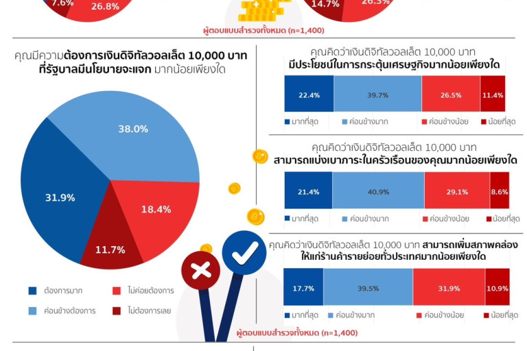 ขณะเดียวกันยังสอบถามว่าถึงงินดิจิทัลวอลเล็ต 10,000 บาทสามารถเพิ่มสภาพคล่องให้แก่ร้านค้ารายย่อยทั่วประเทศความเห็นว่ามีประโยชน์ในการกระตุ้นเศรษฐกิจ พบว่า มีประโยชน์ในระดับมากที่สุด 17.7% มีประโยชน์ค่อนข้างมาก 39.5% มีประโยชน์ค่อนข้างน้อย 31.9% และ มีประโยชน์น้อยที่สุด 10.9%