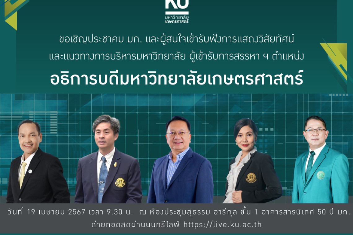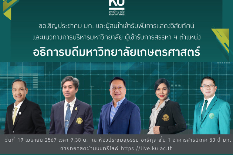 ทั้งนี้ ในวันศุกร์ที่ 19 เมษายน พ.ศ. 2567 เวลา 09.30 น. ณ ห้องประชุมสุธรรม อารีกุล ชั้น 1 อาคารสารนิเทศ 50 ปี มหาวิทยาลัยเกษตรศาสตร์ ผู้สมัครเข้ารับการสรรหาฯ จะนำเสนอวิสัยทัศน์ และแนวทางในการบริหารจัดการมหาวิทยาลัย แก่ประชาคม มก. และผู้สนใจ โดยจะมีการถ่ายทอดสดการนำเสนอวิสัยทัศน์ผ่านระบบ Nontri Live https://live.ku.ac.th/ ด้วย มหาวิทยาลัยเกษตรศาสตร์ จึงขอเรียนเชิญทุกท่านเข้าร่วมรับฟังโดยพร้อมเพรียงกัน
