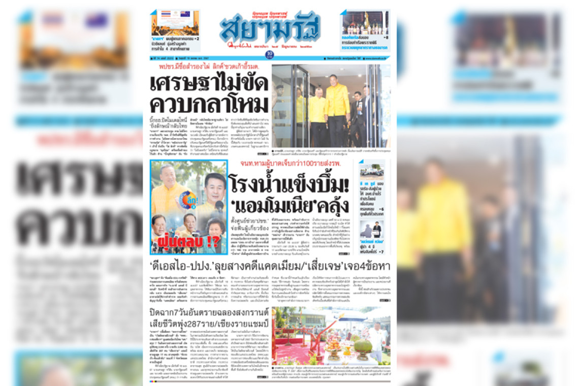 หน้า 1 หนังสือพิมพ์สยามรัฐรายวัน ฉบับวันศุกร์ที่ 19 เมษายน 2567