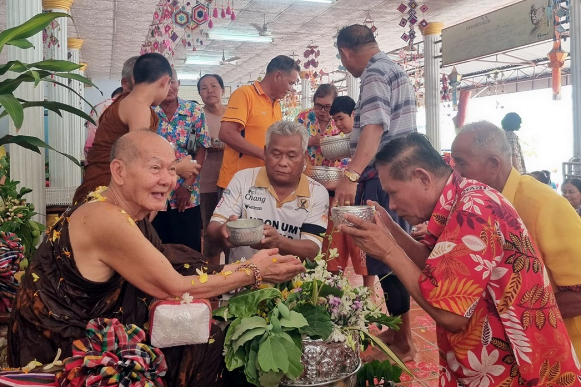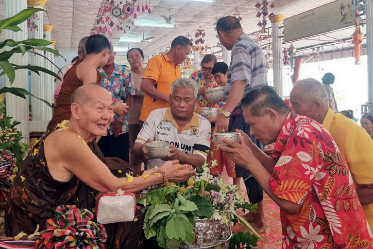 ส่งท้ายสงกรานต์ ที่ จ.กาฬสินธุ์ ยังชุ่มฉ่ำ นายสุดใจ บัวลอย นายกเทศมนตรีตำบล (ทต.) โพนทอง อ.เมือง จ.กาฬสินธุ์ นำคณะผู้บริหาร ทต.โพนทอง ข้าราชการประจำ ทต.โพนทอง และผู้นำชุมชน นำประชาชน ลูกหลาน สรงน้ำ พระครูชิณวงค์โสภณ (หลวงตาวุฒิเวทย์) เจ้าคณะตำบลโพนทอง (ธรรมยุต) เพื่อความเป็นสิริมงคล และเดินทางกลับไปทำงานหลังสงกรานต์โดยสวัสดิภาพ บรรยากาศเต็มไปด้วยความชุ่มฉ่ำ เย็นใจ ท่ามกลางสภาพอากาศที่ร้อนอบอ้าว