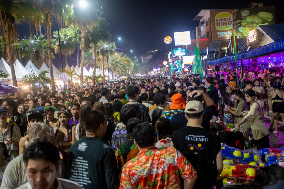 ส่วนถนนสายชายหาด ที่เมืองพัทยา ปิดการจราจรให้นักท่องเที่ยวได้เล่นน้ำกัน ก็มีนักท่องเที่ยวจำนวนมากแห่เล่นน้ำกันอย่างสนุกสนาน ทั้งชาวไทยและต่างประเทศ โดยยิ่งดึกยิ่งมีนักท่องเที่ยวเล่นน้ำกัน สถานบริการหลายแห่งจัดเล่นน้ำมีดนตรีให้นักท่องเที่ยวได้เล่นน้ำกันอย่างสนุกสนานเช่นเดียวกัน
