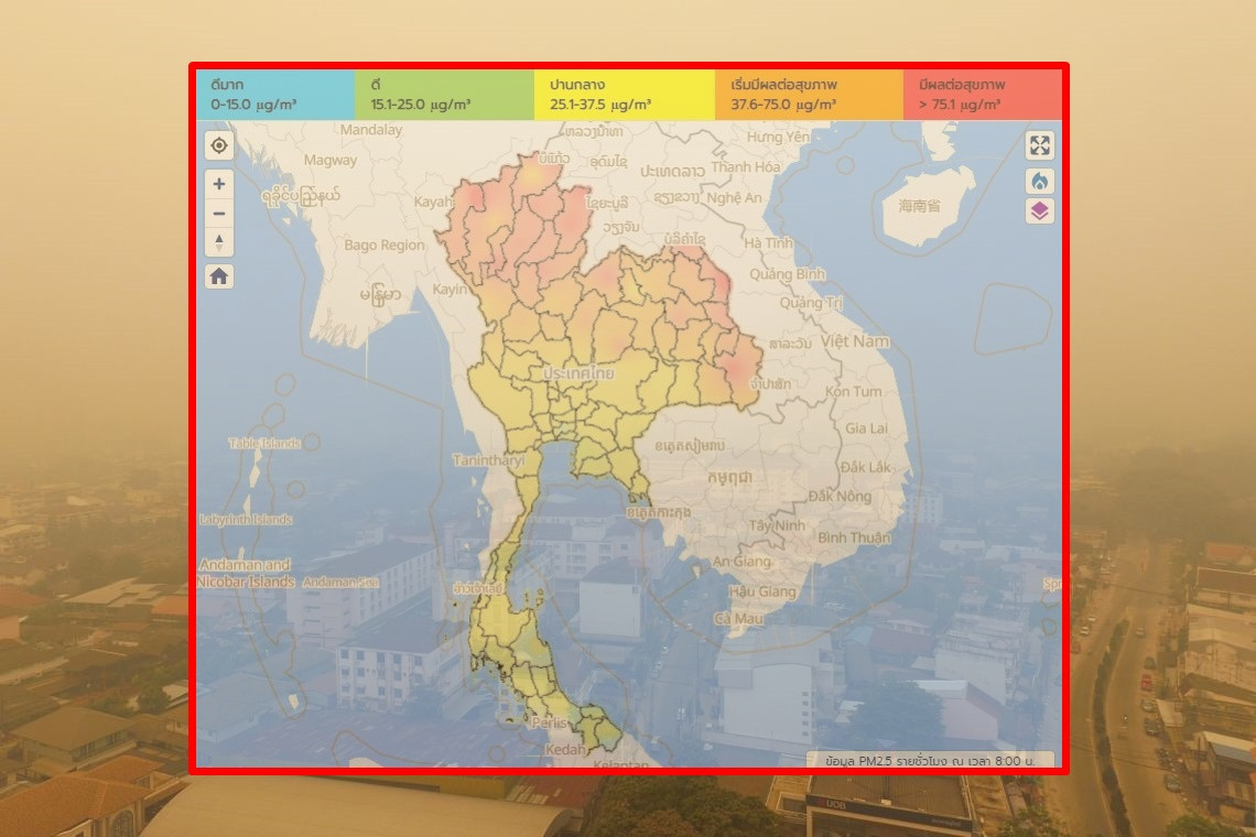 กระทรวงการอุดมศึกษา วิทยาศาสตร์ วิจัยและนวัตกรรม (อว.) โดยสำนักงานพัฒนาเทคโนโลยีอวกาศและภูมิสารสนเทศ (องค์การมหาชน) หรือ GISTDA ร่วมกับสำนักงานการวิจัยแห่งชาติ, กรมควบคุมมลพิษ, มหาวิทยาลัยเกษตรศาสตร์ และมหาวิทยาลัยเชียงใหม่ เกาะติดสถานการณ์ฝุ่น PM 2.5 แบบรายชั่วโมง ด้วยข้อมูลจากดาวเทียมผ่านแอปพลิเคชั่น “เช็คฝุ่น” เมื่อเวลา 08.00 น. ของวันที่ 22 เมษายน 2567 พบ 9 จังหวัด มีค่าฝุ่นเกินเกณฑ์มาตรฐานในระดับสีแดงที่มีผลกระทบต่อสุขภาพและระบบทางเดินหายใจ ได้แก่ #นครพนม 87.3 ไมโครกรัม #น่าน 81.6 ไมโครกรัม #บึงกาฬ 80.1 ไมโครกรัม #พะเยา 79.4 ไมโครกรัม #แม่ฮ่องสอน 79.1 ไมโคกรัม #ลำปาง 77.1 ไมโครกรัม #ลำพูน 76.8 ไมโครกรัม #แพร่ 75.4 ไมโครกรัม #มุกดาหาร 75.2 ไมโครกรัม ส่วนอีก 39 จังหวัดโซนภาคเนือ ภาคกลาง ภาคตะวันออกเฉียงเหนือ และภาคใต้บางจังหวัด มีค่าคุณภาพอากาศเกินมาตรฐานในระดับสีส้ม