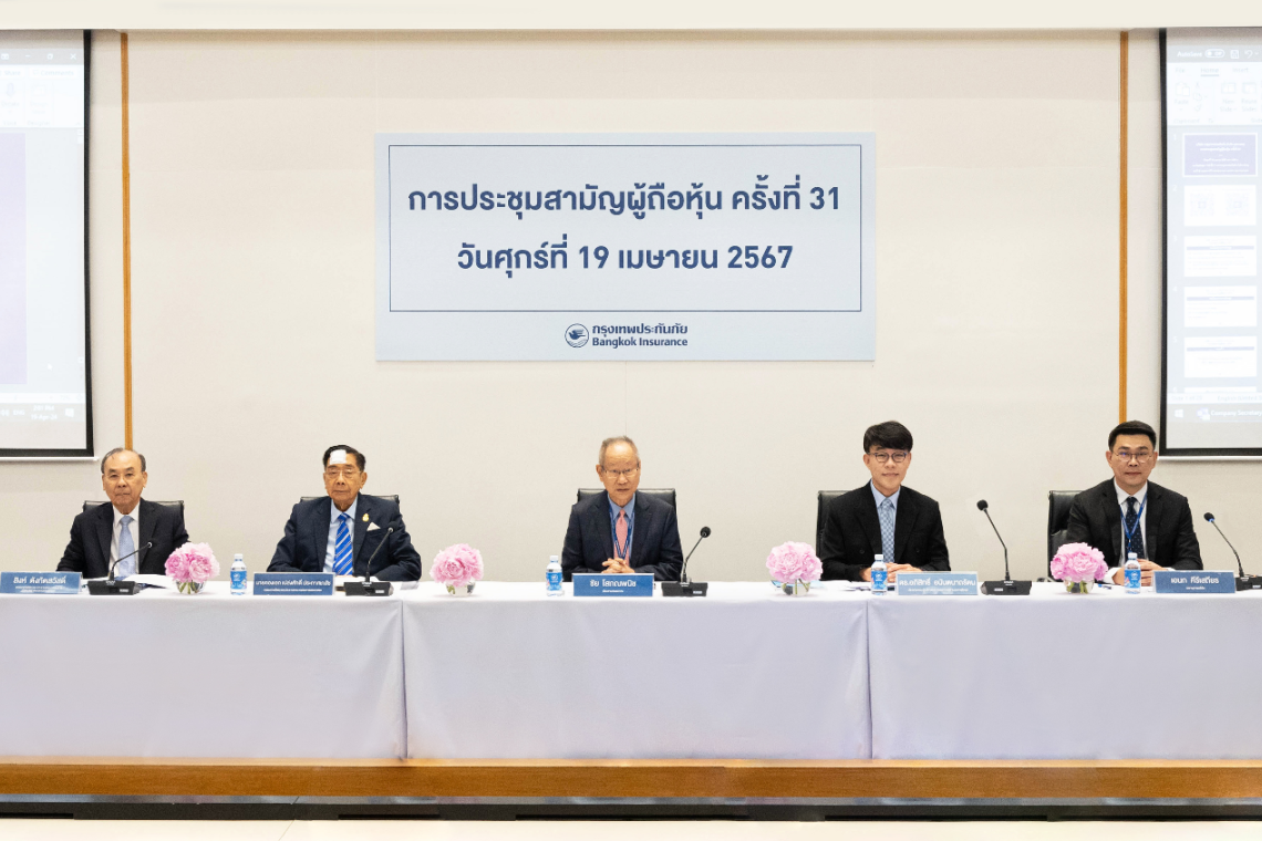 บริษัท กรุงเทพประกันภัย จำกัด (มหาชน) หรือ BKI จัดประชุมสามัญผู้ถือหุ้นประจำปี ครั้งที่ 31 ณ อาคารกรุงเทพประกันภัย สำนักงานใหญ่ ถนนสาทรใต้ เมื่อวันที่ 19 เมษายน 2567 นำโดยนายชัย โสภณพนิช (กลาง) ประธานกรรมการ พร้อมด้วยคณะกรรมการ (จากซ้ายไปขวา) นายสิงห์ ตังทัตสวัสดิ์ กรรมการอิสระและประธานคณะกรรมการกำหนดค่าตอบแทนและสรรหา นายกองเอกเปล่งศักดิ์ ประกาศเภสัช กรรมการอิสระและประธานคณะกรรมการตรวจสอบ ดร.อภิสิทธิ์ อนันตนาถรัตน ประธานคณะผู้บริหารและกรรมการผู้อำนวยการใหญ่ และนายเอนก คีรีเสถียร เลขานุการบริษัท โดยที่ประชุมฯ มีมติอนุมัติเห็นชอบทุกวาระการประชุมตามที่คณะกรรมการเสนอ