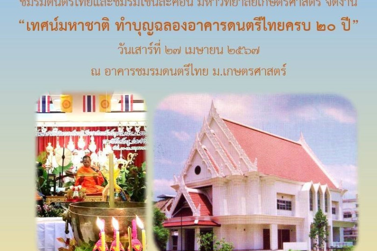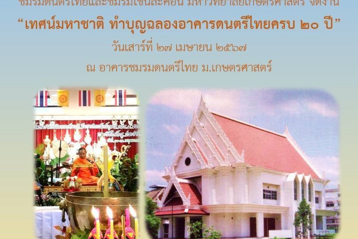 ชมรมดนตรีไทยและชมรมโขนละคอน มหาวิทยาลัยเเกษตรศาสตร์ ร่วมกับ รศ.ลาวัณย์ ไกรเดช จัดเทศน์มหาชาติ ทำบุญฉลองอาคารดนตรีไทยครบ 20 ปี ในวันเสาร์ที่ 27 เมษายน 2567 ณ อาคารชมรมดนตรีไทย ติดกับสำนักพิพิธภัณฑ์และวัฒนธรรมการเกษตร มหาวิทยาลัยเกษตรศาสตร์