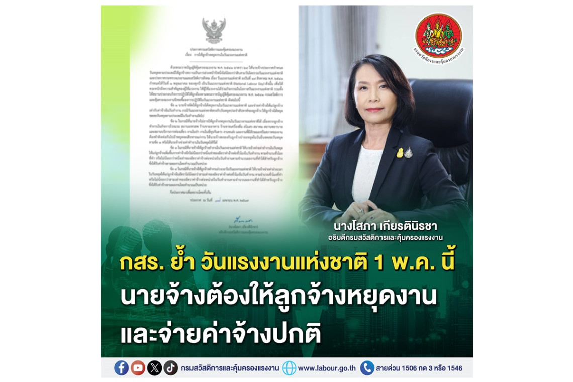 กรมสวัสดิการและคุ้มครองแรงงาน ย้ำเตือนนายจ้างต้องจัดให้ลูกจ้างหยุดงานในวันแรงงานแห่งชาติ 1 พฤษภาคม และจ่ายค่าจ้างเท่ากับวันทำงาน หากมีลูกจ้างจำเป็นต้องทำงานให้หยุดชดเชยในวันถัดไป หรือจ่ายเงินเพิ่มไม่น้อยกว่าหนึ่งเท่าของวันปกติ