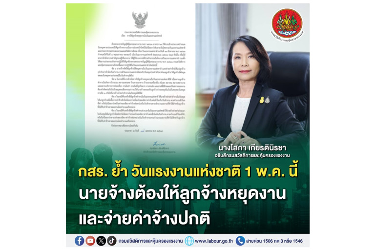 นางโสภา เกียรตินิรชา อธิบดีกรมสวัสดิการและคุ้มครองแรงงาน (กสร.) เปิดเผยว่า พระราชบัญญัติคุ้มครองแรงงาน พ.ศ.2541 ได้กำหนดให้นายจ้างประกาศกำหนดวันหยุดตามประเพณีให้ลูกจ้างทราบเป็นการล่วงหน้าปีหนึ่งไม่น้อยกว่า 13 วันโดยรวมวันแรงงานแห่งชาติ วันที่ 1 พฤษภาคมด้วย กสร.จึงขอฝากย้ำเตือนไปยังนายจ้าง สถานประกอบกิจการให้ปฏิบัติตามกฎหมายอย่างเคร่งครัด โดยจัดให้ลูกจ้างได้หยุดงานในวันแรงงานแห่งชาติและจ่ายค่าจ้างให้แก่ลูกจ้างเท่ากับค่าจ้างในวันทำงาน กรณีที่วันแรงงานแห่งชาติตรงกับวันหยุดประจำสัปดาห์ของลูกจ้าง ให้ลูกจ้างได้หยุดชดเชยวันหยุดตามประเพณีในวันทำงานถัดไป สำหรับกรณีที่นายจ้างไม่อาจให้ลูกจ้างหยุดงานในวันดังกล่าวได้เนื่องจากลูกจ้างทำงานในกิจการโรงแรม สถานมหรสพ ร้านขายอาหาร ร้านขายเครื่องดื่ม สโมสร สมาคม สถานพยาบาลและสถานบริการการท่องเที่ยว งานในป่า งานในที่ทุรกันดาร งานขนส่ง และงานที่มีลักษณะงานหรือสภาพของงานต้องทำติดต่อกันไปถ้าหยุดจะเสียหายแก่งานนั้น ให้นายจ้างตกลงกับลูกจ้างว่าจะหยุดชดเชยในวันอื่นแทนหรือให้นายจ้างจ่ายค่าทำงานในวันหยุดให้ก็ได้